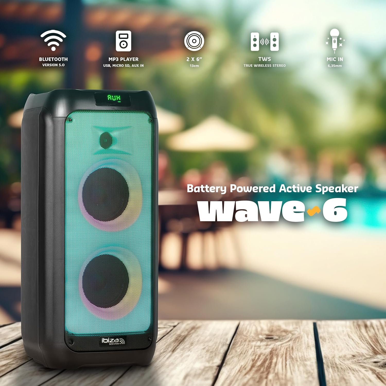 - WAVE 6: Leistungsstarker, batteriebetriebener Aktivlautsprecher mit zwei 5,25"/13cm-Lautsprechern, IbizaSound-Qualität und einem LED-Lichtspiel (Fire) über die gesamte Vorderseite.