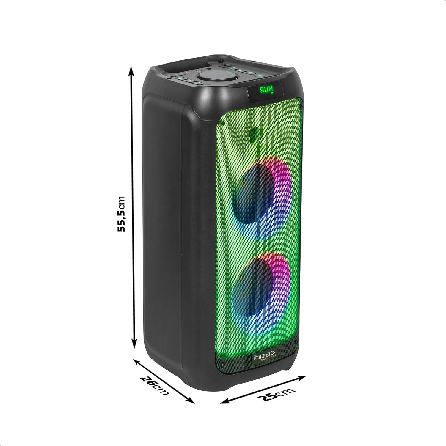 - EIGENSCHAFTEN: IbizaSound, 250 W Leistung, 2 x 5, 25"/13 cm Lautsprecher und 1 x 1"/2,5 cm Hochtöner. Vorderseite mit LED-Effekt (FIRE) ausgestattet (zahlreiche programmierte Effekte). Bluetooth, USB-Laufwerk (Ladefunktion) und MicroSD, sowie Eingänge: