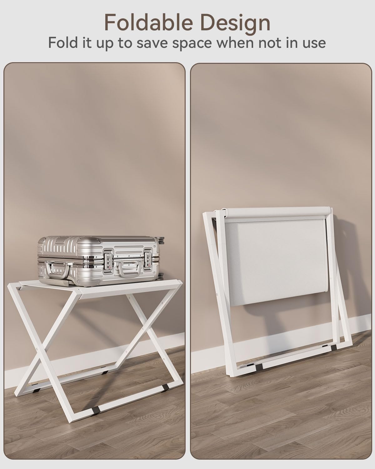 - Space saving: The luggage rack has a foldable structure that can be quickly folded and stored when not in use. It is thin and easy to store under the bed, in a closet, or in a corner, saving space and improving space utilization.
