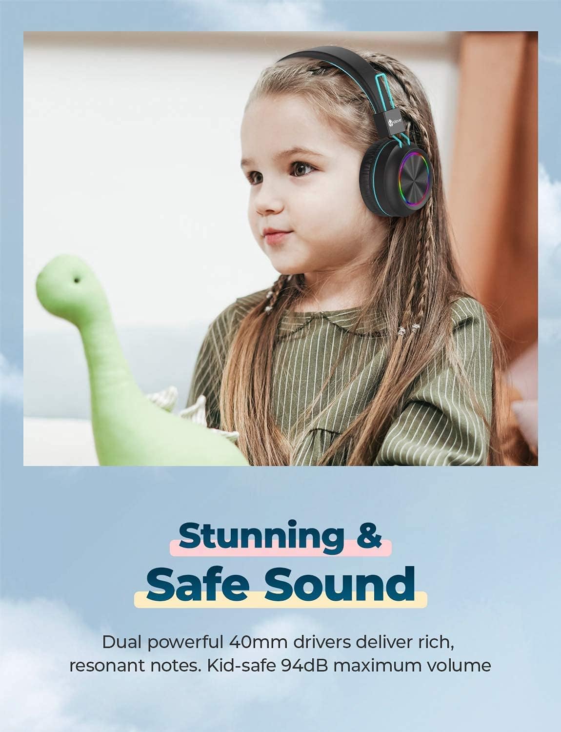 - 【Stereo-Sound mit Kopfhörer Leuchten】:Sieht cool aus, klingt grossartig! Zusätzlich zu den 40-mm-Treibern, die den iClever Kinder-Bluetooth-Kopfhörern einen vollen, immersiven Sound liefern, verfügen sie über eine Reihe von LED-Lichtern, die um