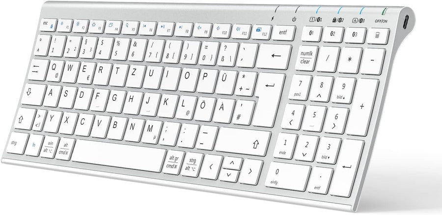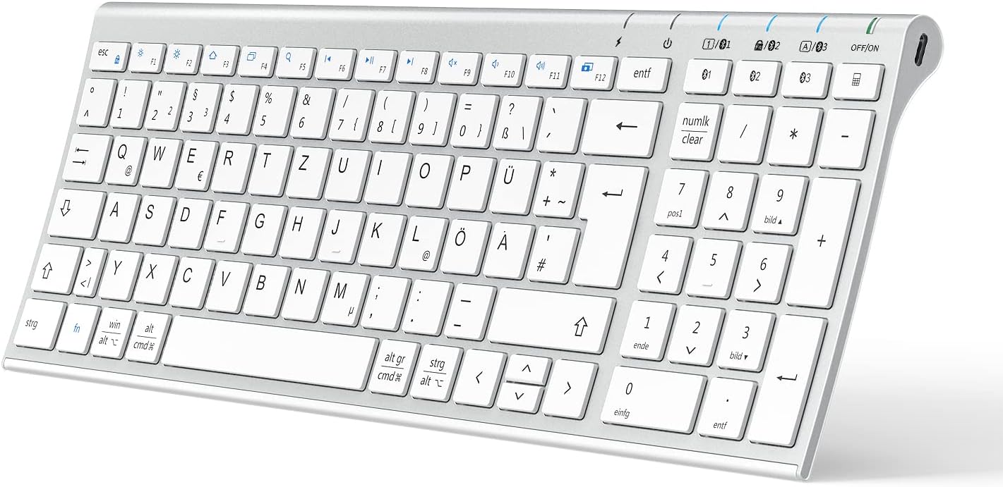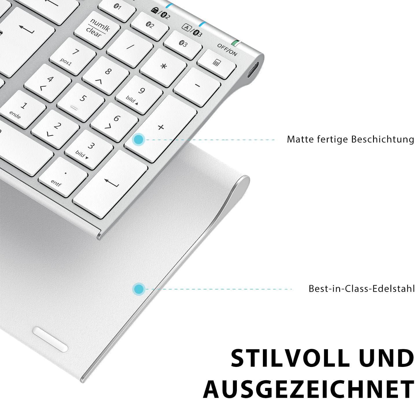 - STABILE BLUETOOTH 5.1- UND MULTI-DEVICE-VERBINDUNG - Die Bluetooth-Tastatur kann mit bis zu 3 Geräten gepaart und nahtlos mit der integrierten Bluetooth 5.1-Technologie zwischen diesen umgeschaltet werden. Es erkennt automatisch Ihr Gerät und ordnet