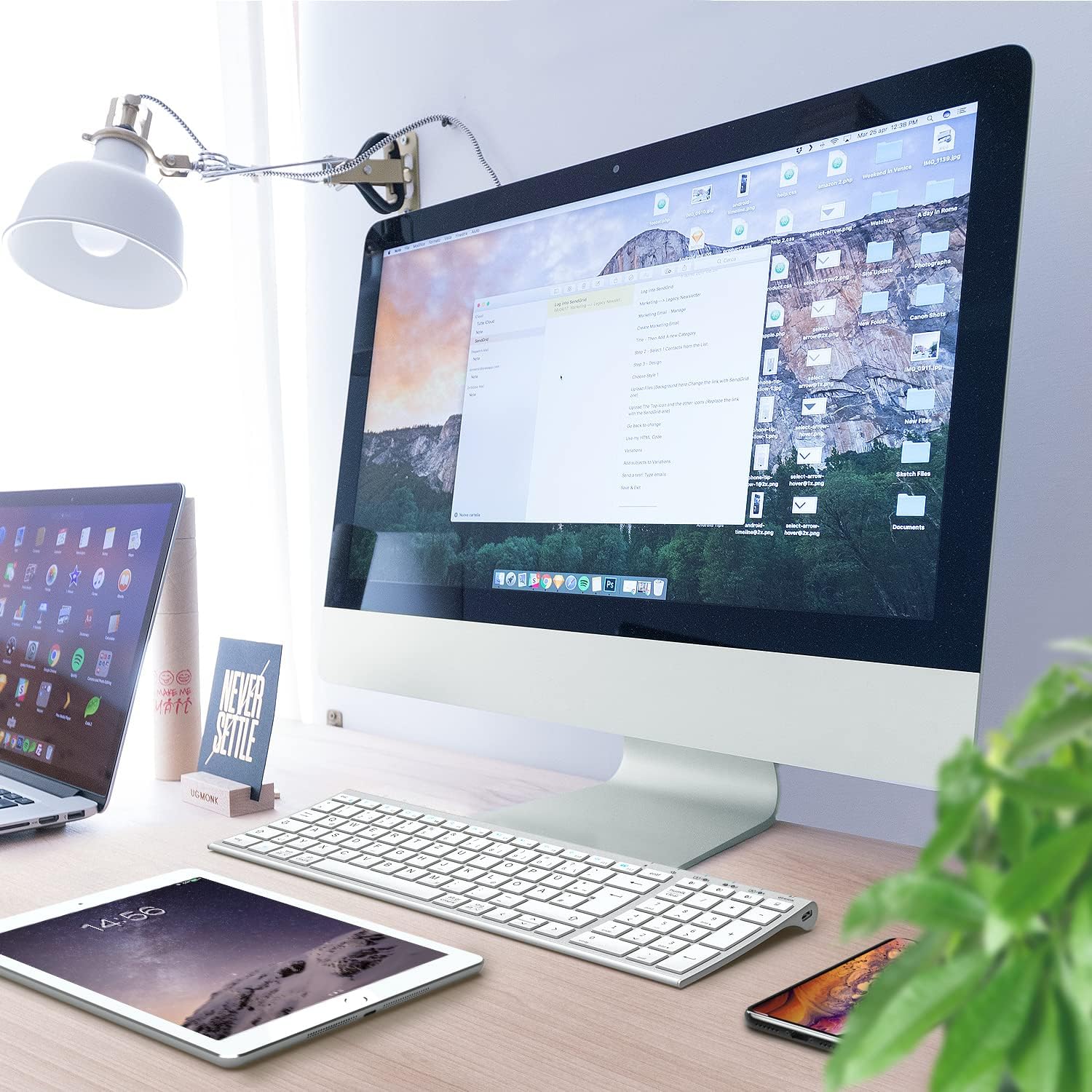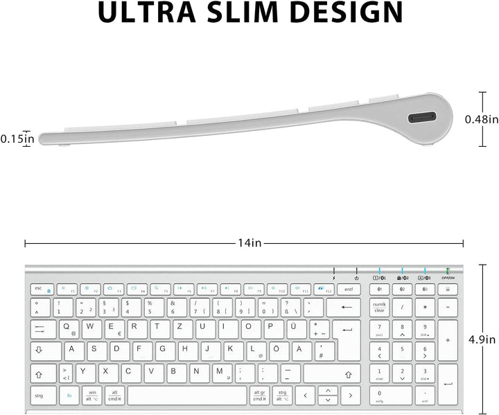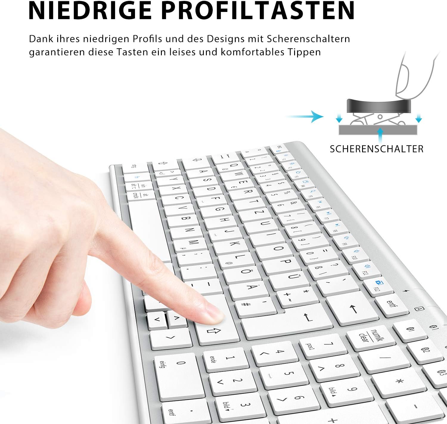 - VOLLE GRÖSSE UND ULTRA-SLIM-TASTATUR - Die Funktastatur ist in Komplettgrösse und verfügt über einen Ziffernblock, mit dem Sie einfacher und komfortabler. Das Layout entspricht dem Industriestandard und bietet Tastenkombinationen wie Stummschalten,