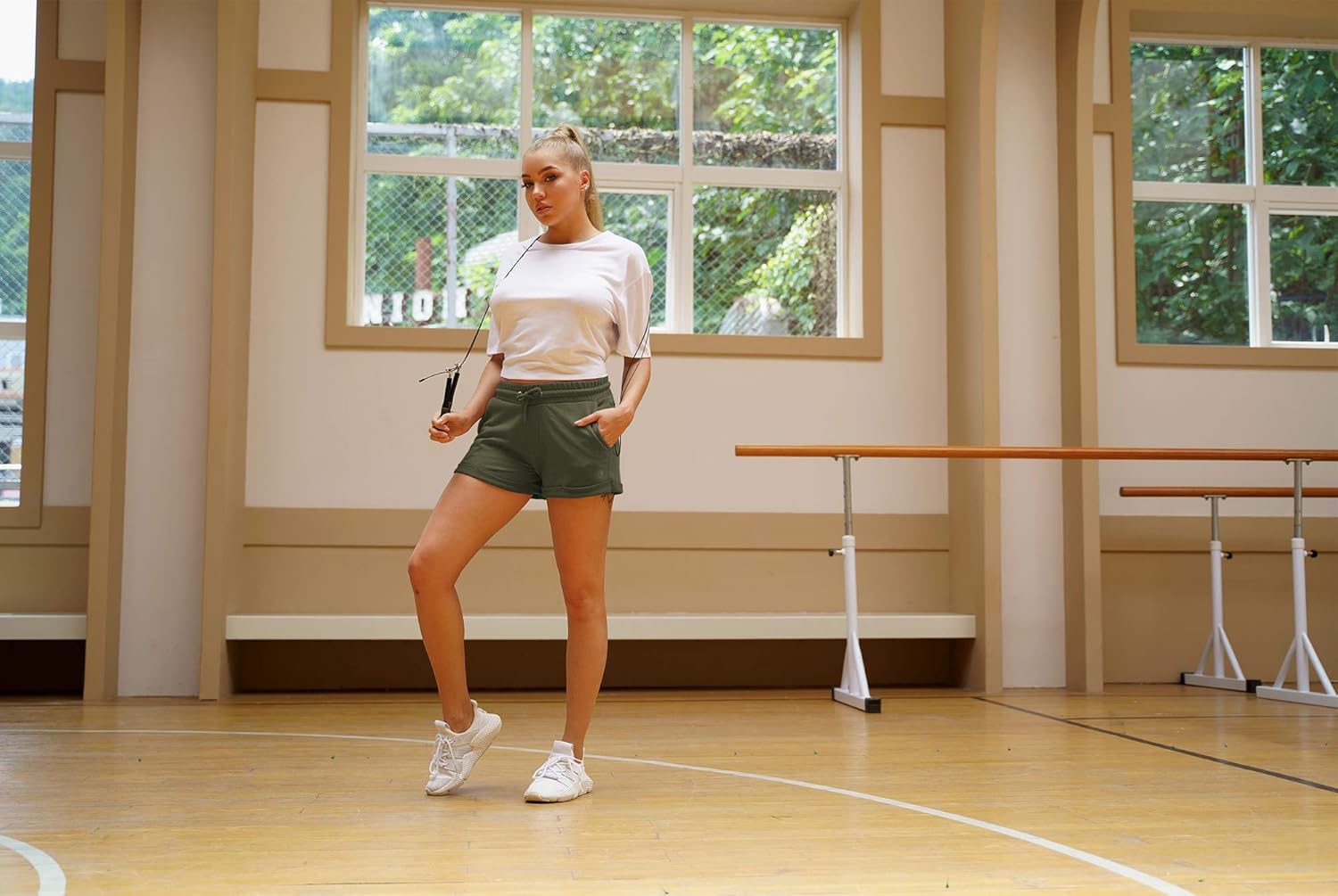 • √ Damen Sweatshorts mit elastischem Gummibund und Tunnelzug, 2 Seitentasche und gekrempelten Saum