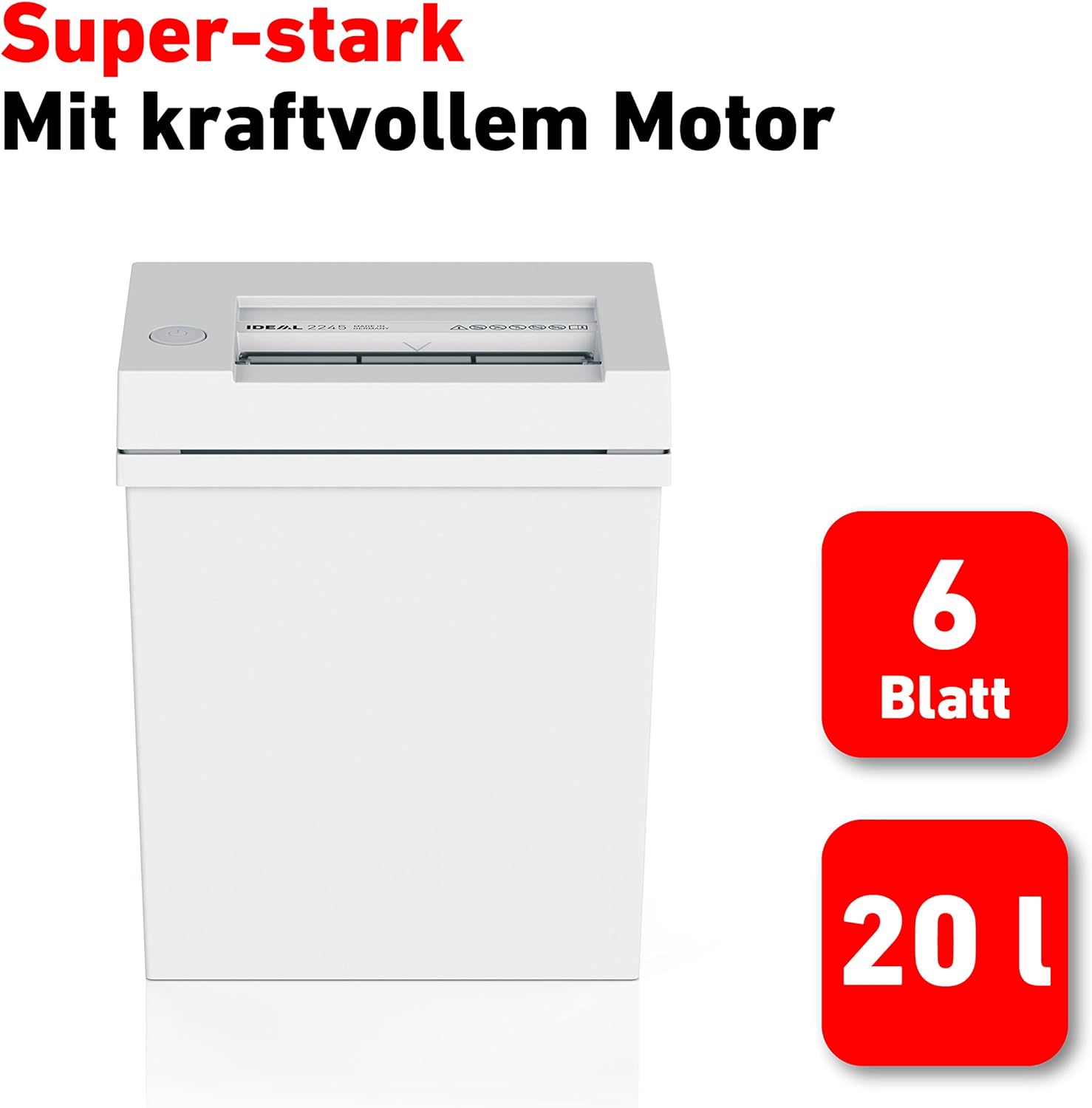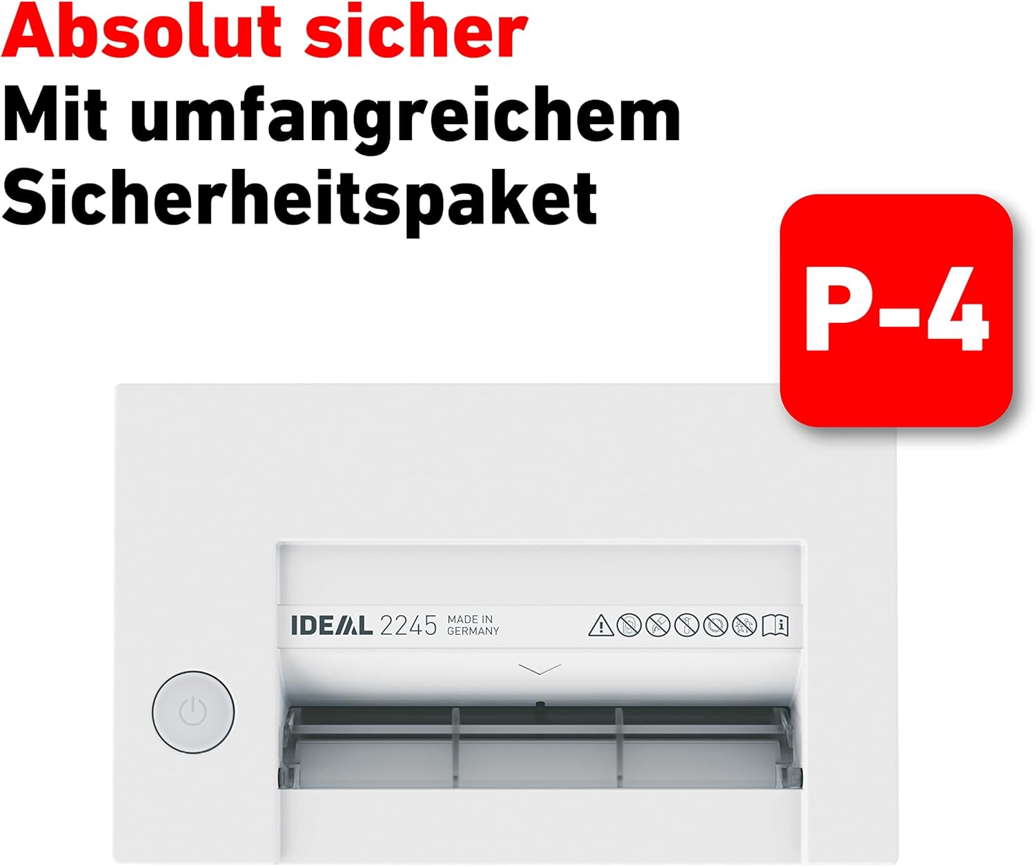 - Verarbeitung mit Qualitätskomponenten und Materialien von, meist deutschen Herstellern . Für Langlebigkeit „Made in Germany“. Lieferumfang: 1 x IDEAL 2245 Aktenvernichter, Partikelschnitt 3 x 25 mm, Sicherheitsstufe P4, Masse 428 x 345 x 213 mm (H