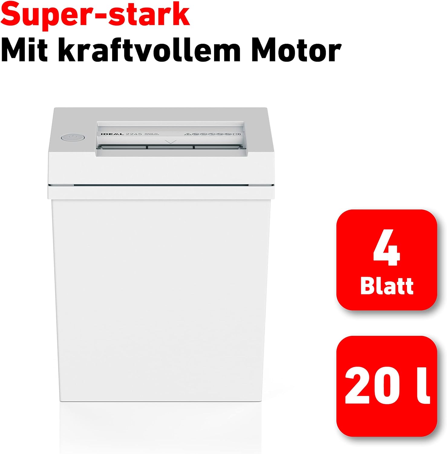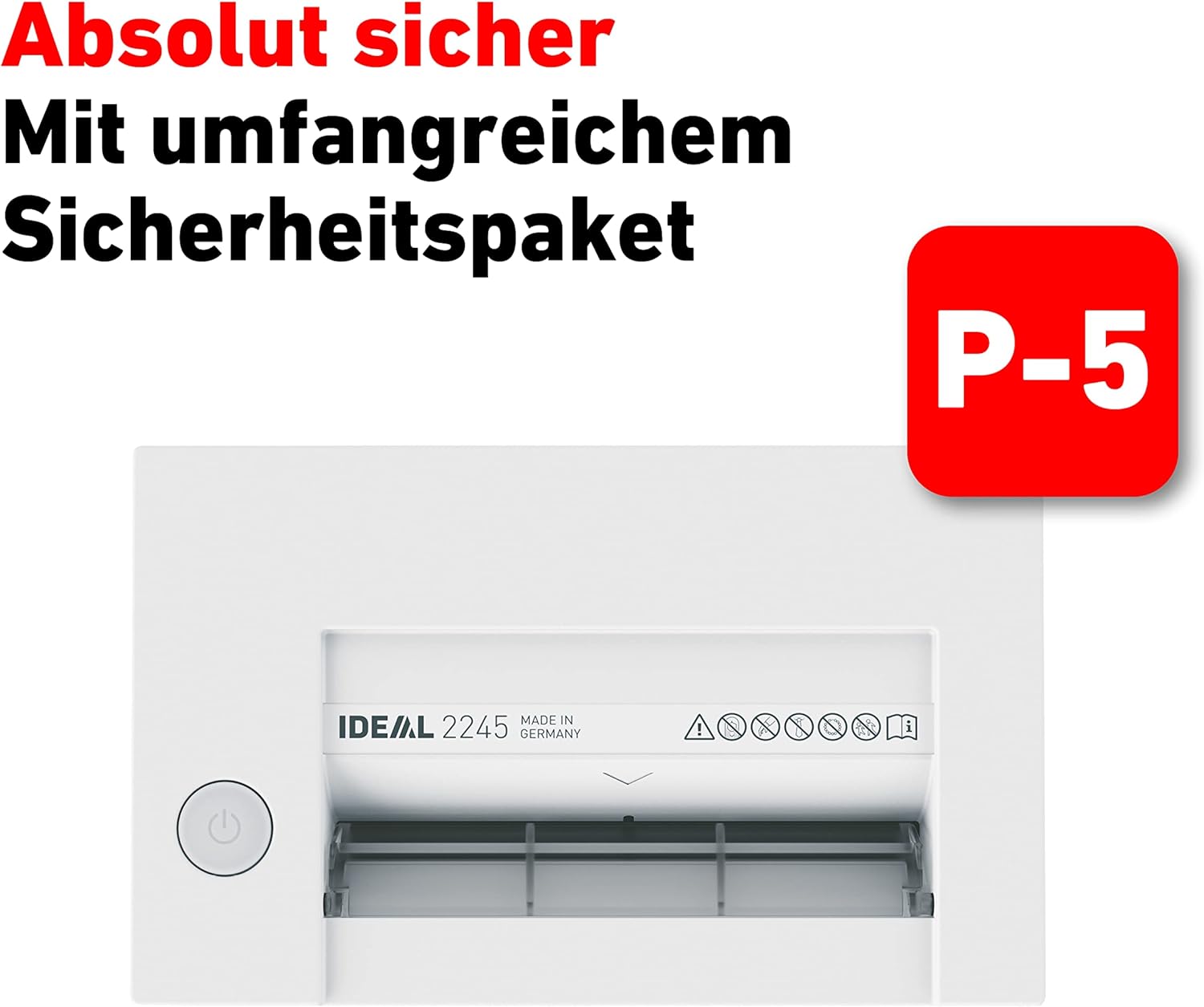 • Verarbeitung mit Qualitätskomponenten und Materialien von, meist deutschen Herstellern. Für Langlebigkeit „Made in Germany“. Lieferumfang: 1 x IDEAL 2245 Aktenvernichter, Partikelschnitt 2 x 15 mm, Sicherheitsstufe P5, Masse 428 x 345 x 213 mm (H x