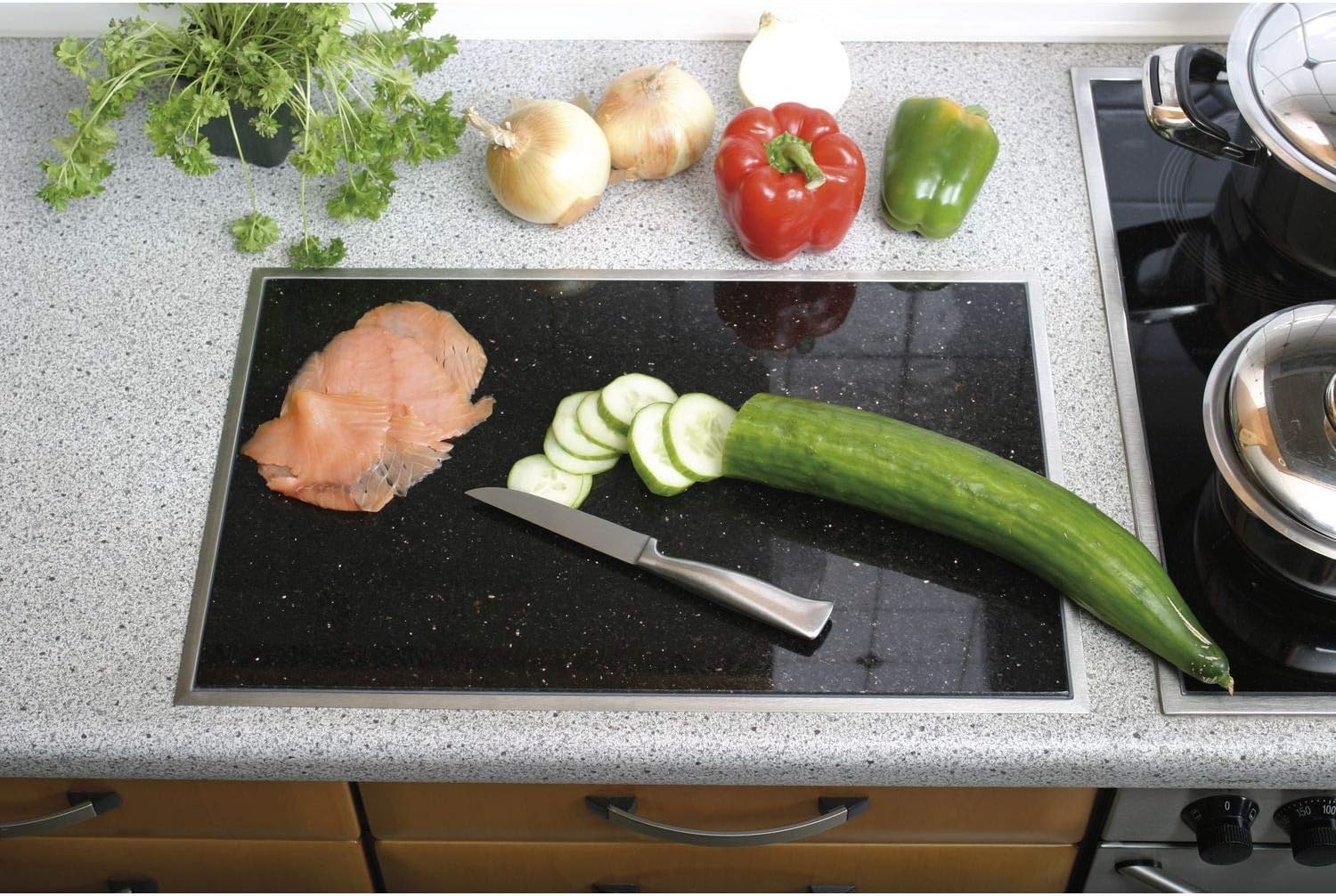 - Sie können einen heissen Topf abstellen oder das Granitfeld problemlos als Schneidfläche verwenden