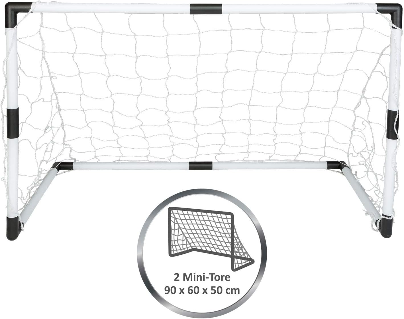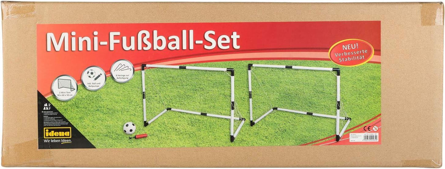 - Set mit zwei Fussballtoren mit weissen Rahmen aus Kunststoff und weissen Netzen, je ca. 90 x 60 x 50 cm, inklusive Ball und Ballpumpe, empfohlen für Kinder ab 6 Jahren