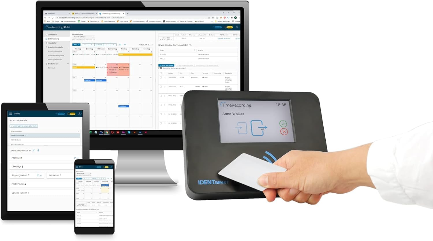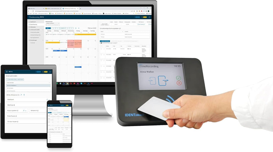 - Umfangreiches Arbeitszeiterfassungssystem - komplett mit Terminal, Mitarbeiterkarten und Webanwendung