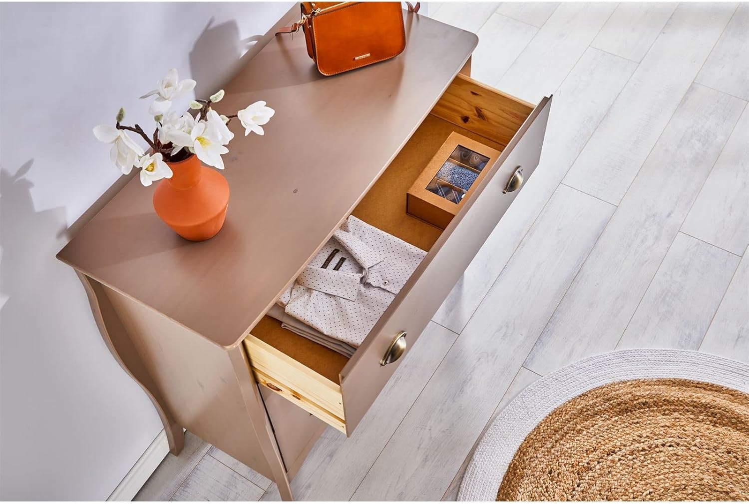 - Diese stilvolle Anrichte mit Schubkasten auf Metallauszügen ist auch ein praktisches Möbel für Gästezimmer oder Schlafzimmer, in der sie Ihre T-Shirts, Socken oder Wäsche aufbewahren können