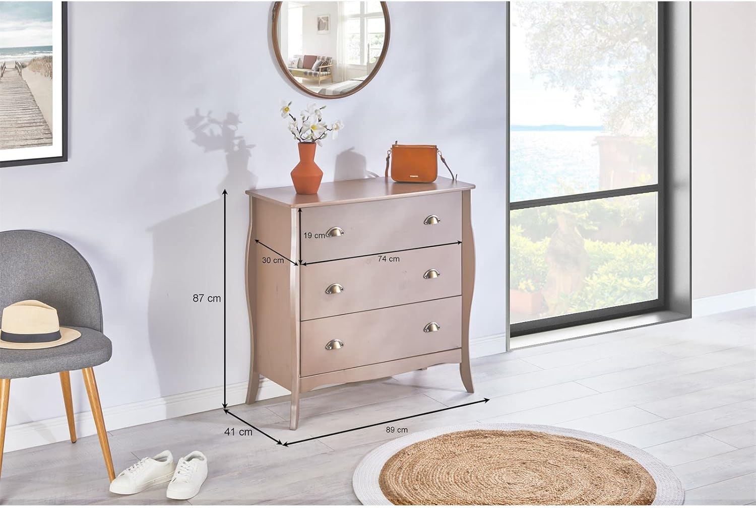 - Aufbaumass Kommode: 89 x 87 x 43 cm (Breite x Höhe x Tiefe)