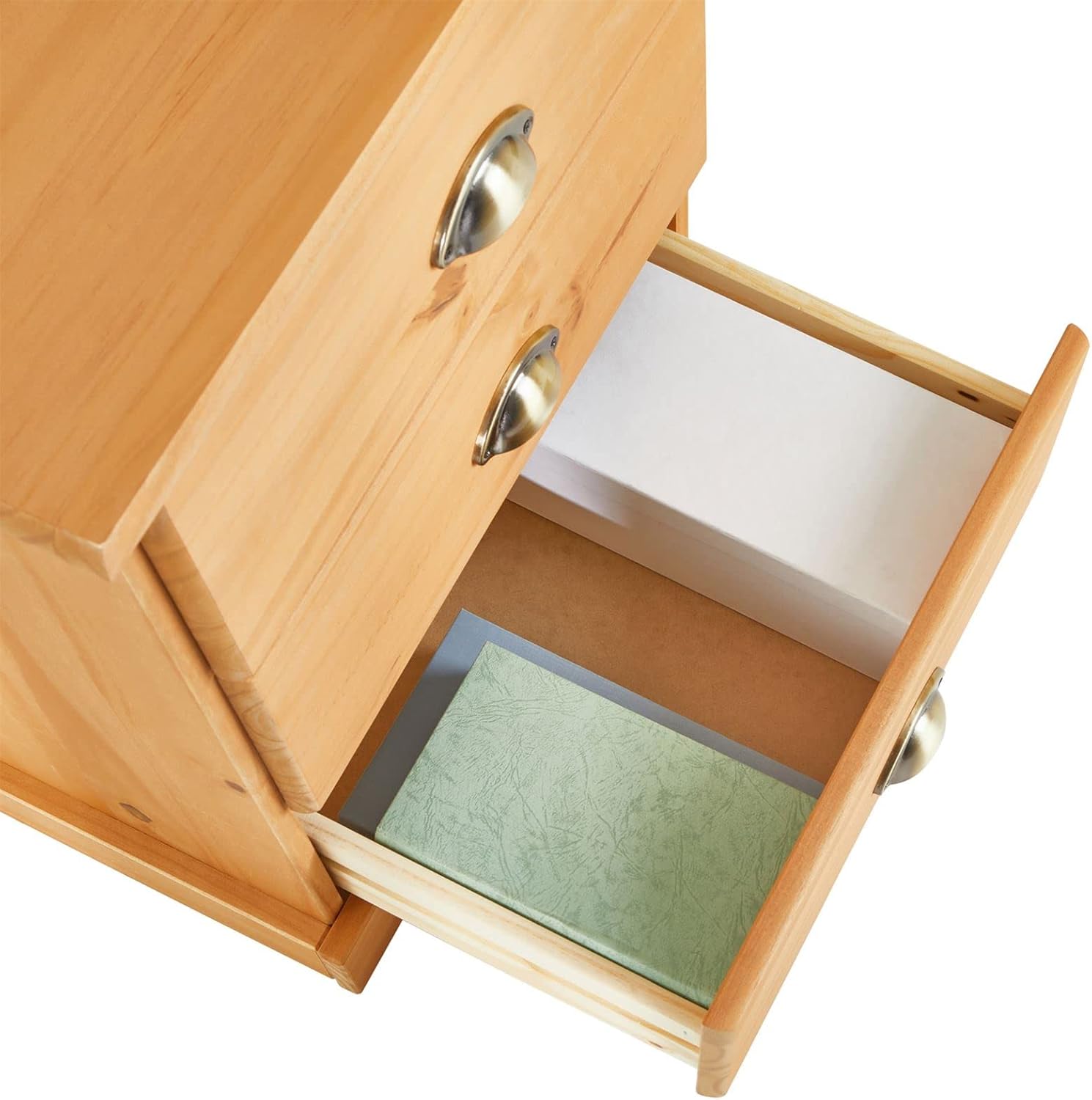 • Nachtkommode aus massivem Kiefernholz und mit einer lackierten Oberfläche, die die Holzmaserung sichtbar lässt