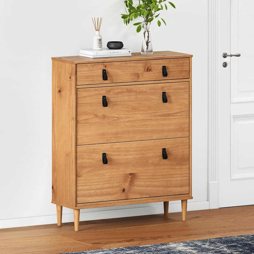 - Farbe: Hergestellt aus Massiver Kiefer und Eichefarben lackiert, fügt sich der Schuhkipper MIKKA stilvoll in jedes Zuhause ein. Die natürliche Maserung des Holzes bleibt sichtbar, während die braunen Ledergriffe einen eleganten Akzent setzen