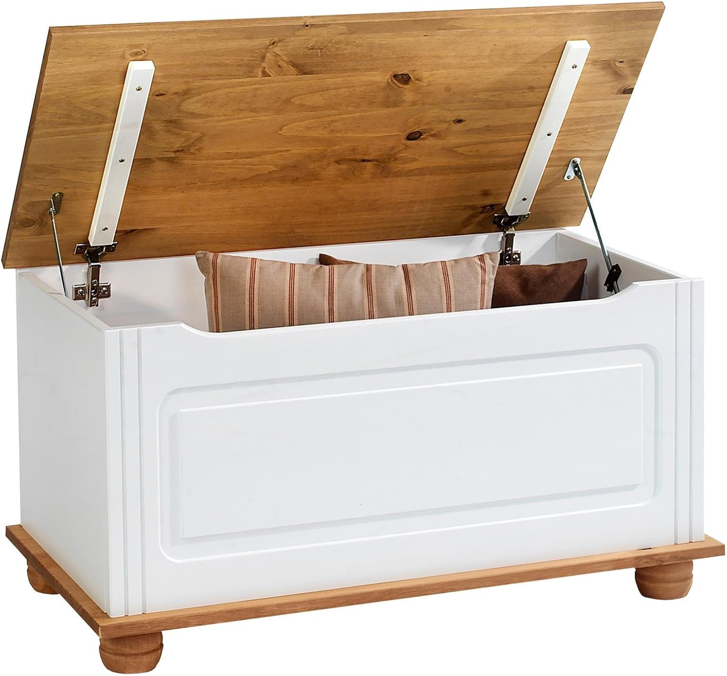 - robuste Sitztruhe im Landhausstil gefertigt aus massiver Kiefer und mit einer lackierten oder gewachsten Oberfläche