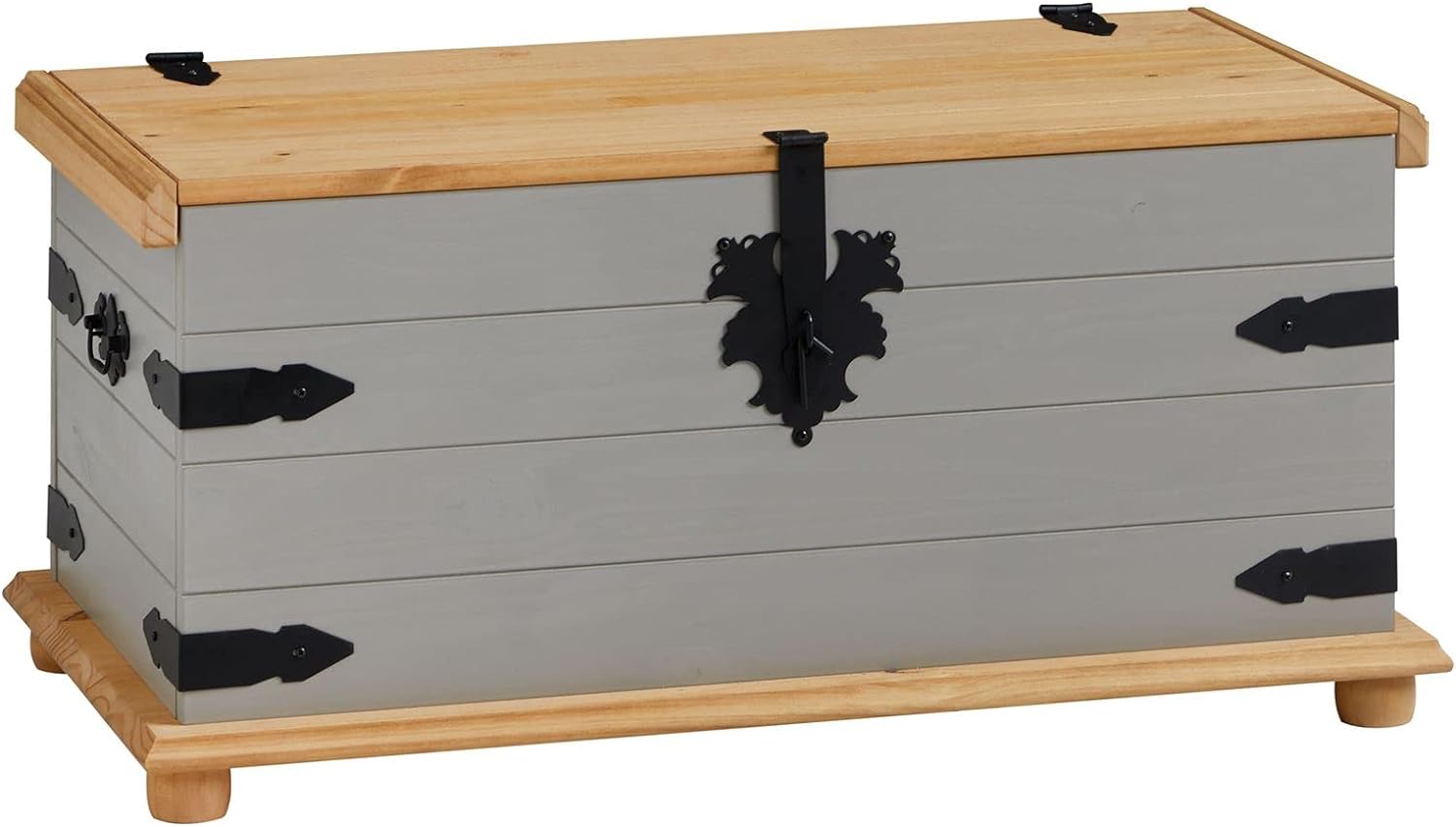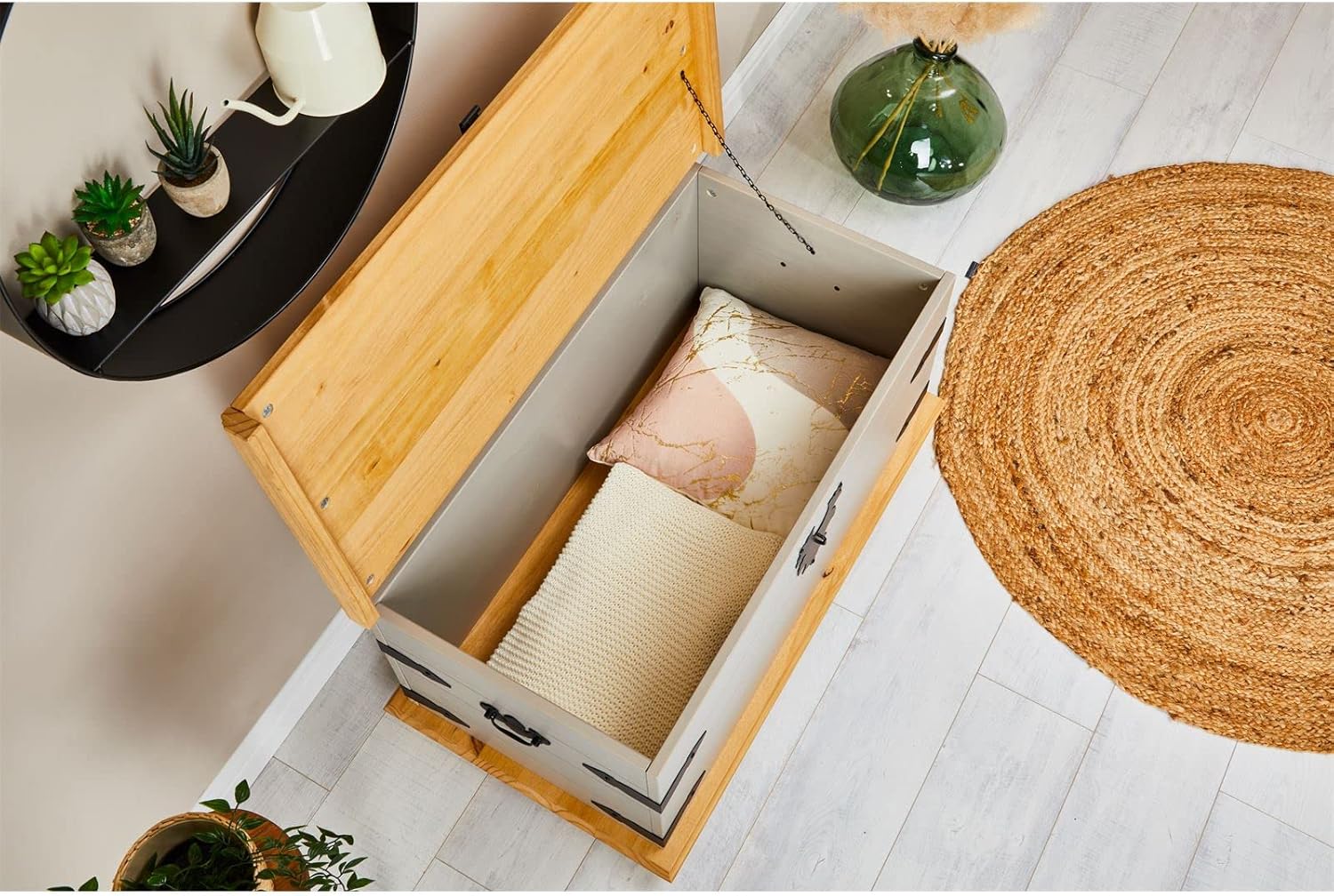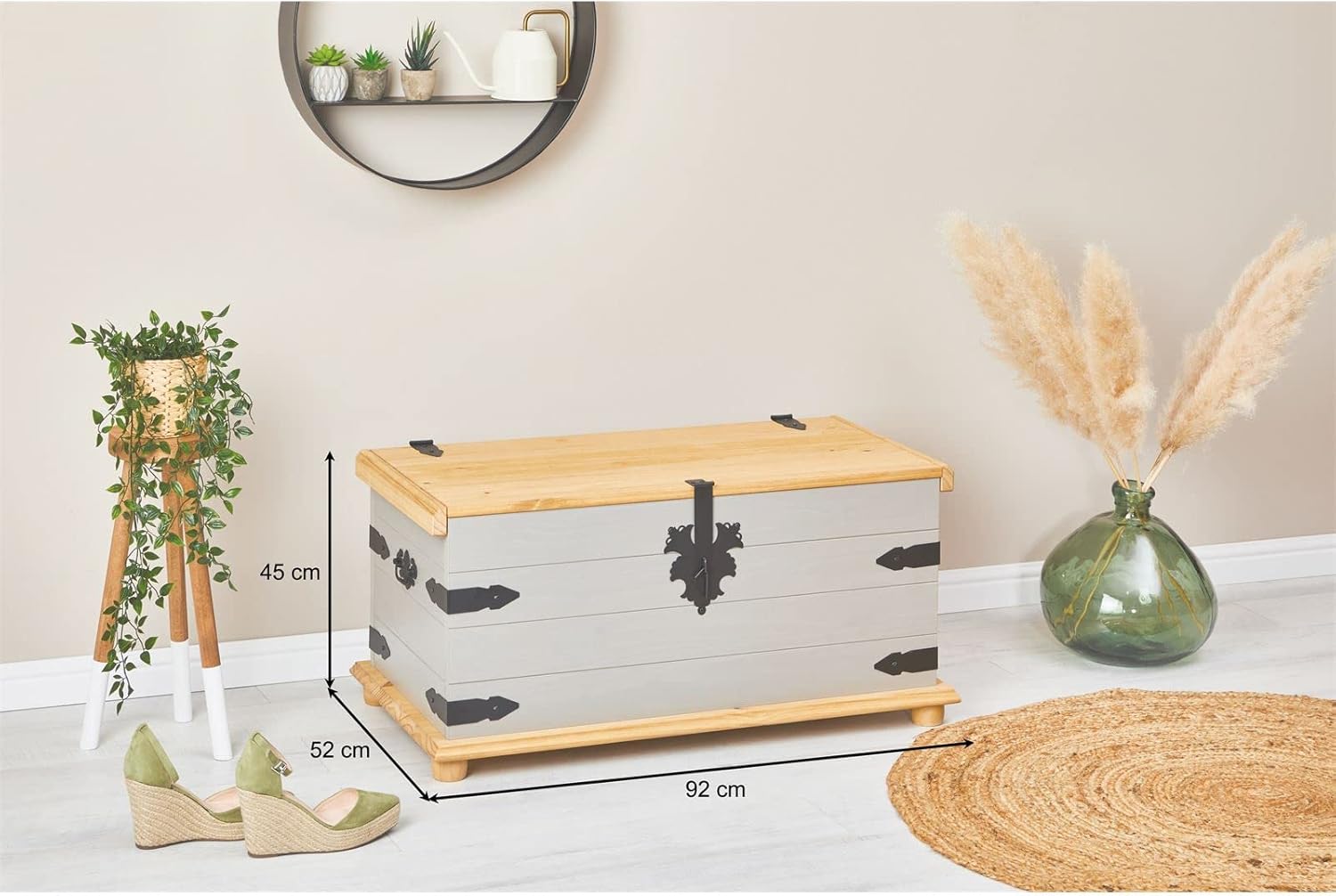 - Material: Die Holztruhe ist aus massivem Kiefernholz gefertigt und hat eine Holzstärke von 18 mm