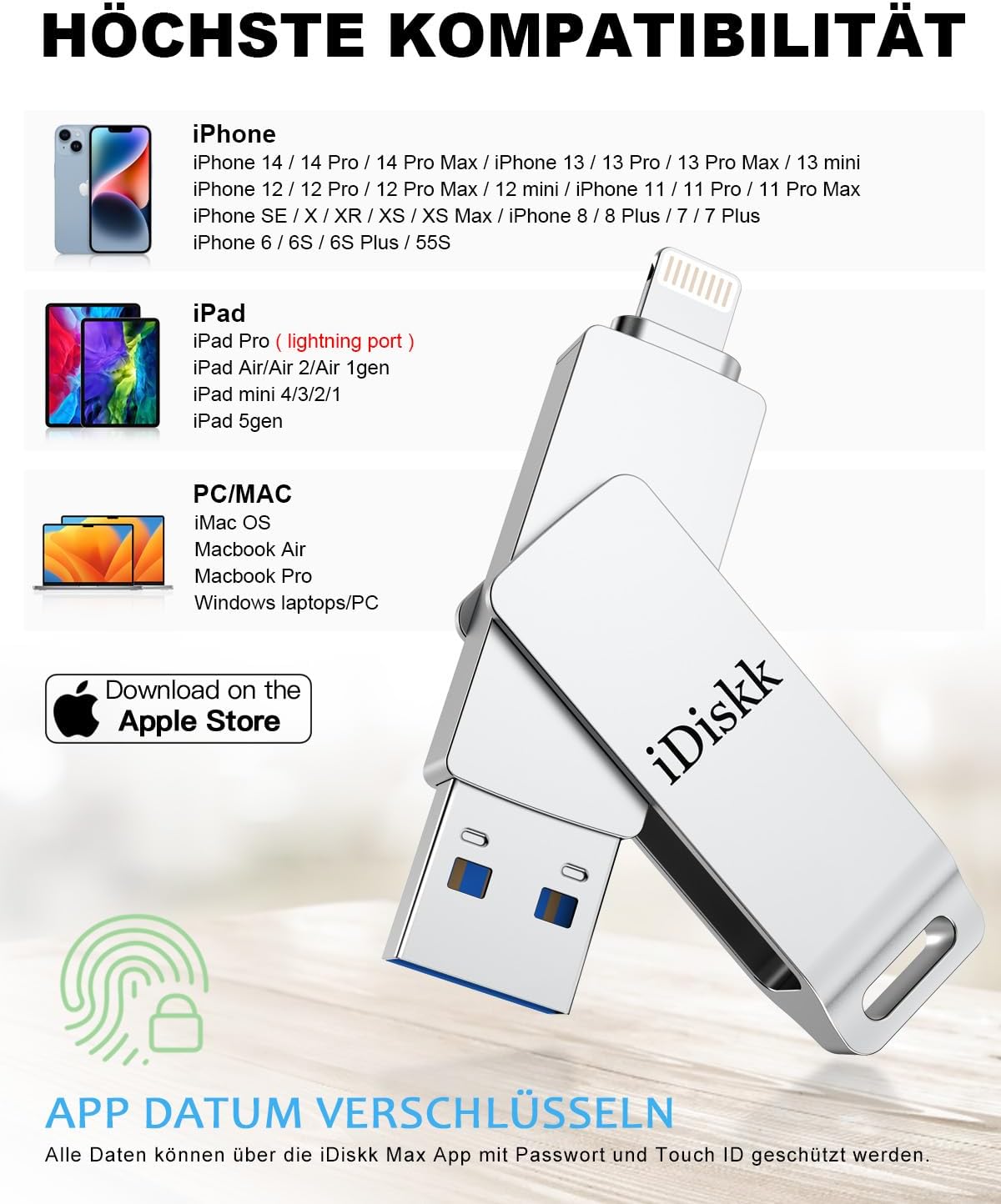 - √【MFi-zertifizierte und zuverlässige Qualität】 - Mit authentischer MFi-Zertifizierung zur Gewährleistung von Stabilität und Sicherheit ist die kostenlose und stabile App im Apple Store erhältlich, iDiskk-Fotostick für iPhone unterstützt