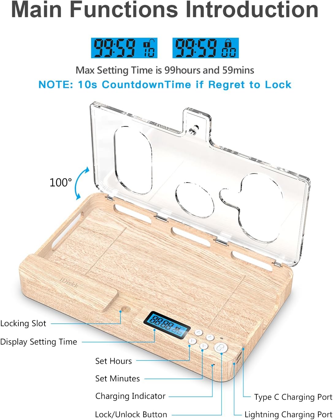 • 👍【Humanisierte und rĂŒcksichtsvolle Zeiteinstellung】Das iDiskk Timed VerriegelungsgehĂ€use kann fĂŒr jede Zeit zwischen 1 min und 99 Stunden gesperrt werden. Sperren Sie Ihr Telefon gleichzeitig und verwenden Sie das Kabel, um Ihre Telefone