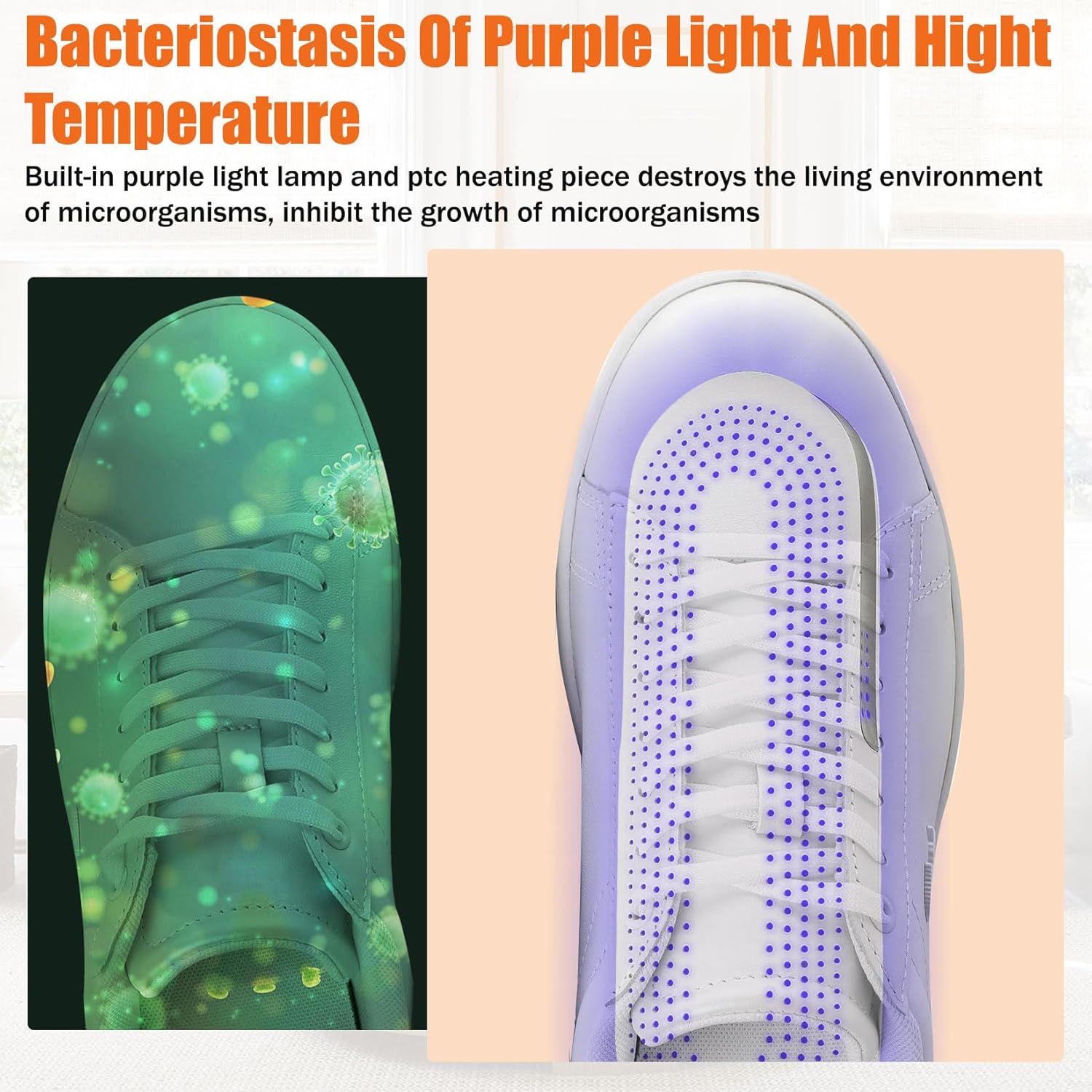 - đ„ŸăAntibakterielle Wirkungă- Ausgestattet mit einem leistungsstarken PTC-Heizelement und violette Licht, eliminieren unsere Schuhtrockner effektiv unangenehme GerĂŒche und hemmen das Wachstum von Bakterien. Dies bedeutet nicht nur frischere Schuhe,