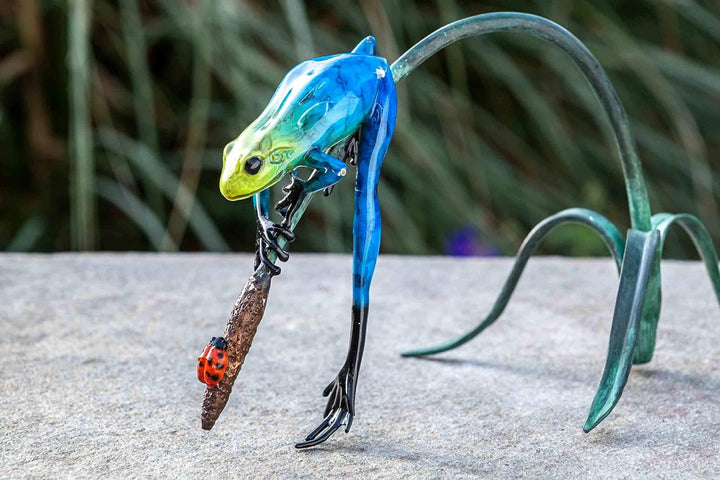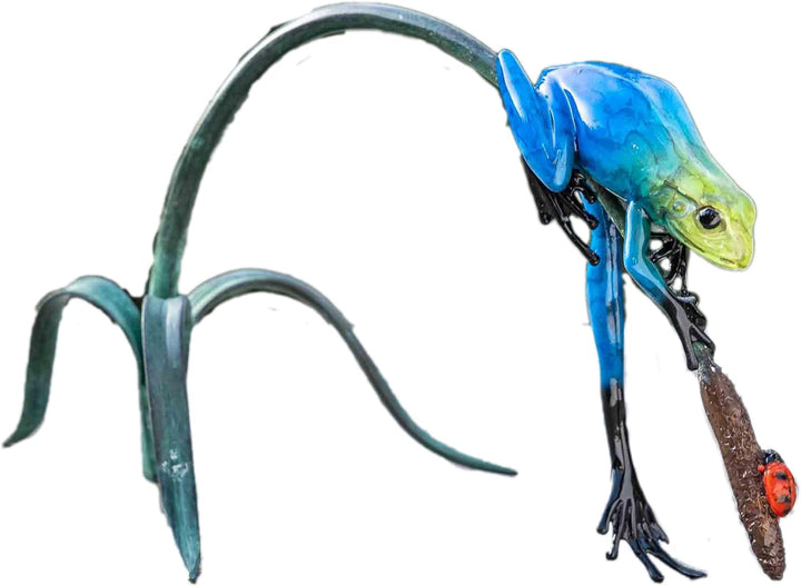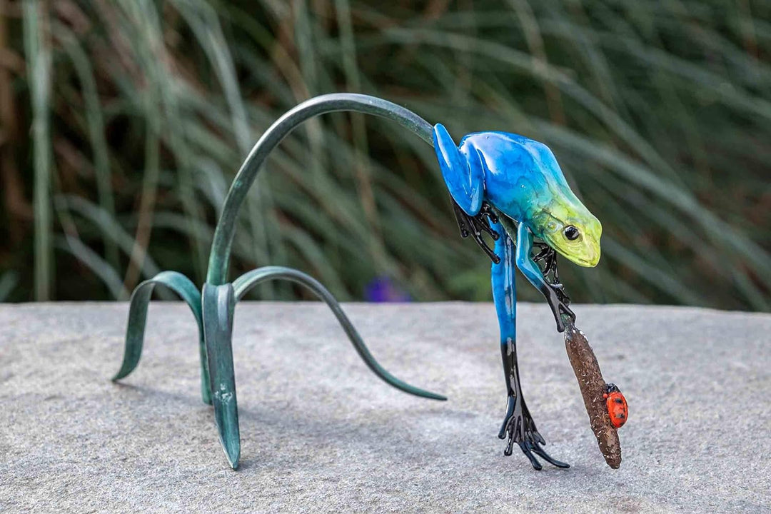 IDYL Bronze-Skulptur Blauer Frosch auf einem AST | 15x12x28 cm | Tierfigur aus Bronze handgefertigt