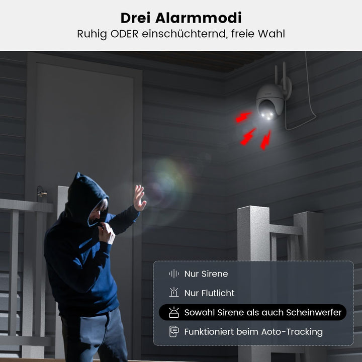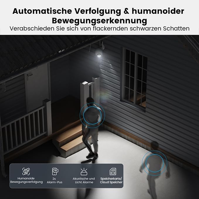 - 【Bewegungserkennung & Ton und Lichtalarm】Diese outdoor kamera wlan verfügt über eine Bewegungserkennung. Sobald diese überwacherungskamera outdoor Bewegungen erkennt, wird der Alarm ausgelöst und Sie erhalten Echtzeit-Benachrichtigungen,damit Sie