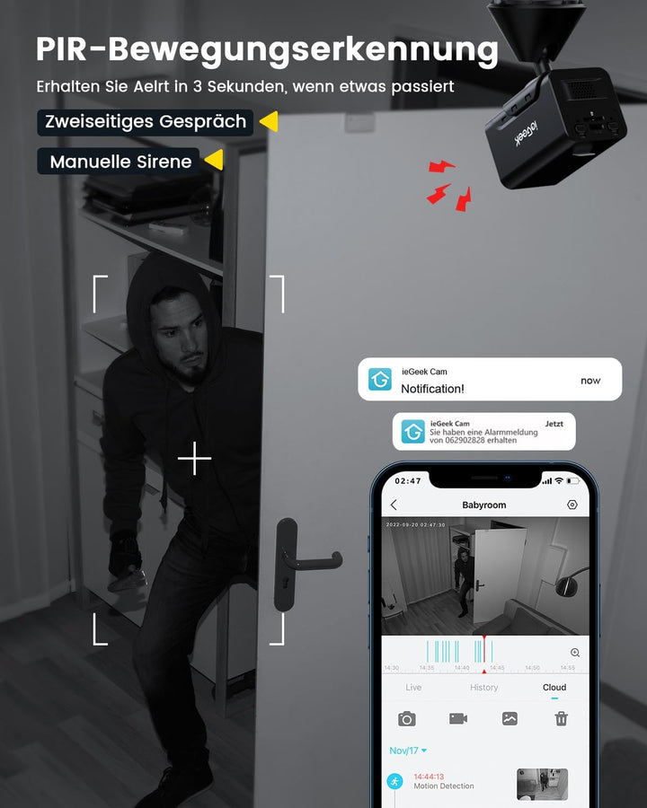 - 💖[PIR-Bewegungserkennung und Alarmbenachrichtigung] 🔔Überwachungskamera mit bewegungsmelder & Baby Haustier Monitor. Humanoide Objekterkennung und Empfindlichkeit 1-10 Stufen einstellbar, je höher der Wert desto genauer und weniger Fehlalarme.