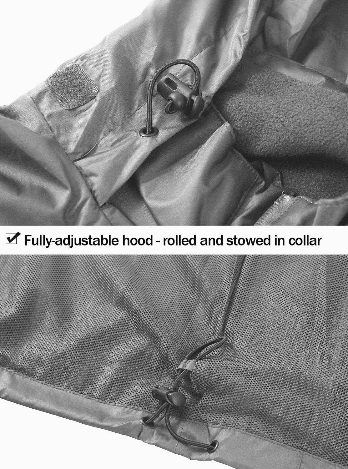 • 🌧 Regenjacke - Die Regenjacke hat zwei wasserdichte Taschen auf der Vorderseite und eine doppelte Abdichtung, die das Eindringen von Wasser durch den Reissverschluss verhindert. Mit einem Klettverschluss am oberen Ende des Hutes können Sie die Höhe