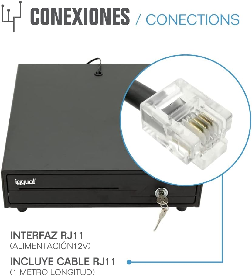 • Registrierkasse mit 3 Verriegelungsschlössern, die manuell oder automatisch über einen RJ11-Anschluss geöffnet werden können. Verriegelung in offener oder geschlossener Position möglich | 1 Meter RJ11 Kabel enthalten