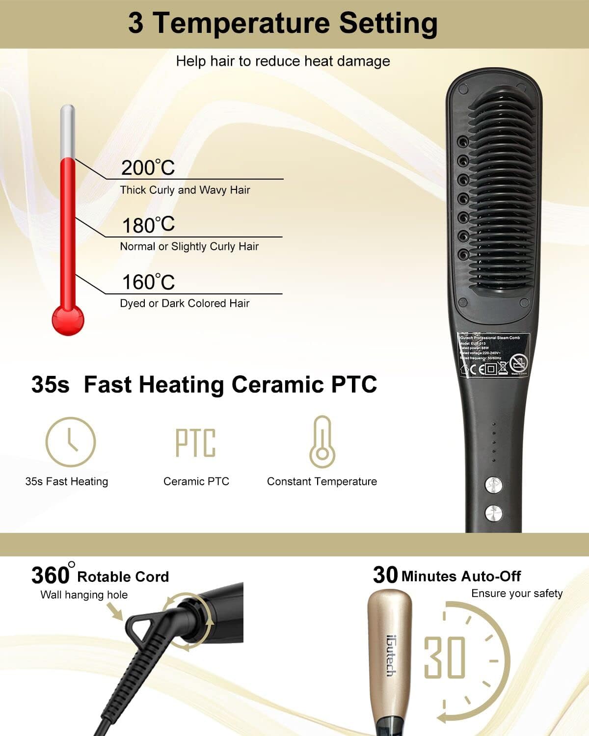 - Dampffunktion: Der iGutech professionelle Dampf-Kamm mit Dampfbefeuchtungsfunktion auf Nano-Ebene kann in deinem Haar mit 0,6g Dampf pro Minute Feuchtigkeit konzentrieren und es bis zu 48 Stunden lang resistent gegen kräuseln machen und seine Glätte um