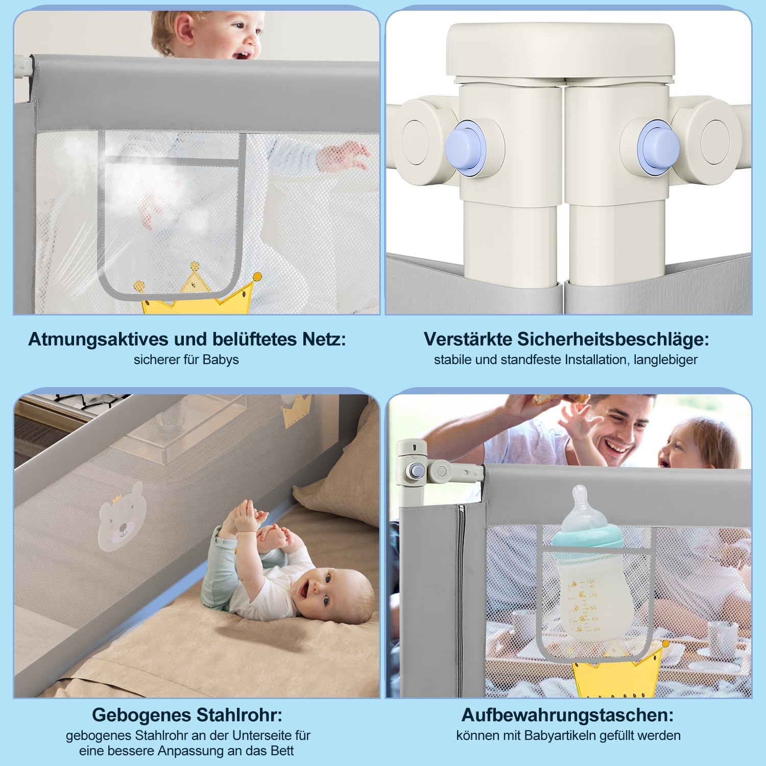 - ❤【Hochwertiges Material】Der Gesamtrahmen von Babybettgitter ist aus hochwertigem, verdicktem Stahlrohr gefertigt, das sehr stabil und haltbar ist und nicht leicht bricht. Das atmungsaktive Mesh-Polyestermaterial ist atmungsaktiv und bequem, und das