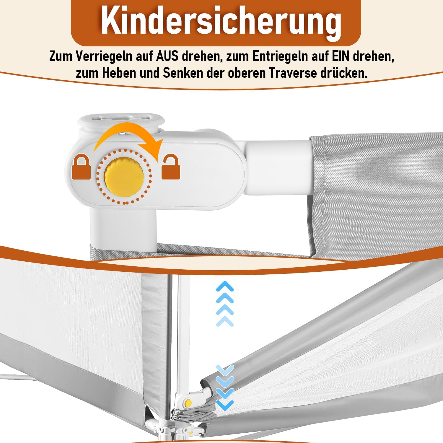 - 【Klappbares Bettgitter, höhenverstellbar】Das Kinderbettgitter ist in 150/180/200 cm, in drei Grössen erhältlich. Die Höhe der Gitter kann flexibel zwischen 68 und 95 cm eingestellt werden, so dass sie für verschiedene Bettgrössen geeignet sind