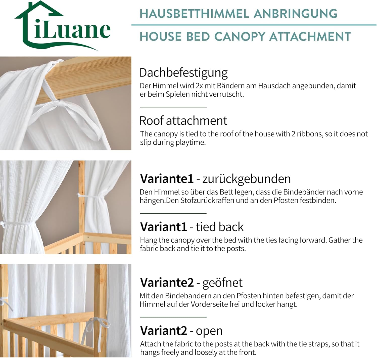 - Pflegeleicht: Unser Hausbett-Himmel ist einfach zu pflegen und waschbar. Vor der Montage einfach bei 30°C im Schonwaschgang waschen. Danach zum Trocknen aufhängen, und schon ist der Betthimmel wieder einsatzbereit. Dank seiner hochwertigen Materialien