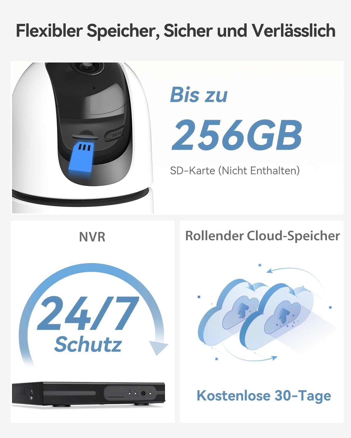 • 【Kompatibel mit Alexa& Mehrfachansicht& Flexible Speicherung】Verbinden Sie die Kamera mit Alexa und übermitteln Sie Sprachbefehle, um Echtzeitansichten Ihrer Küche/Wohnzimmer/Kinderzimmers zu erhalten. Unterstützt die gleichzeitige Anzeige von