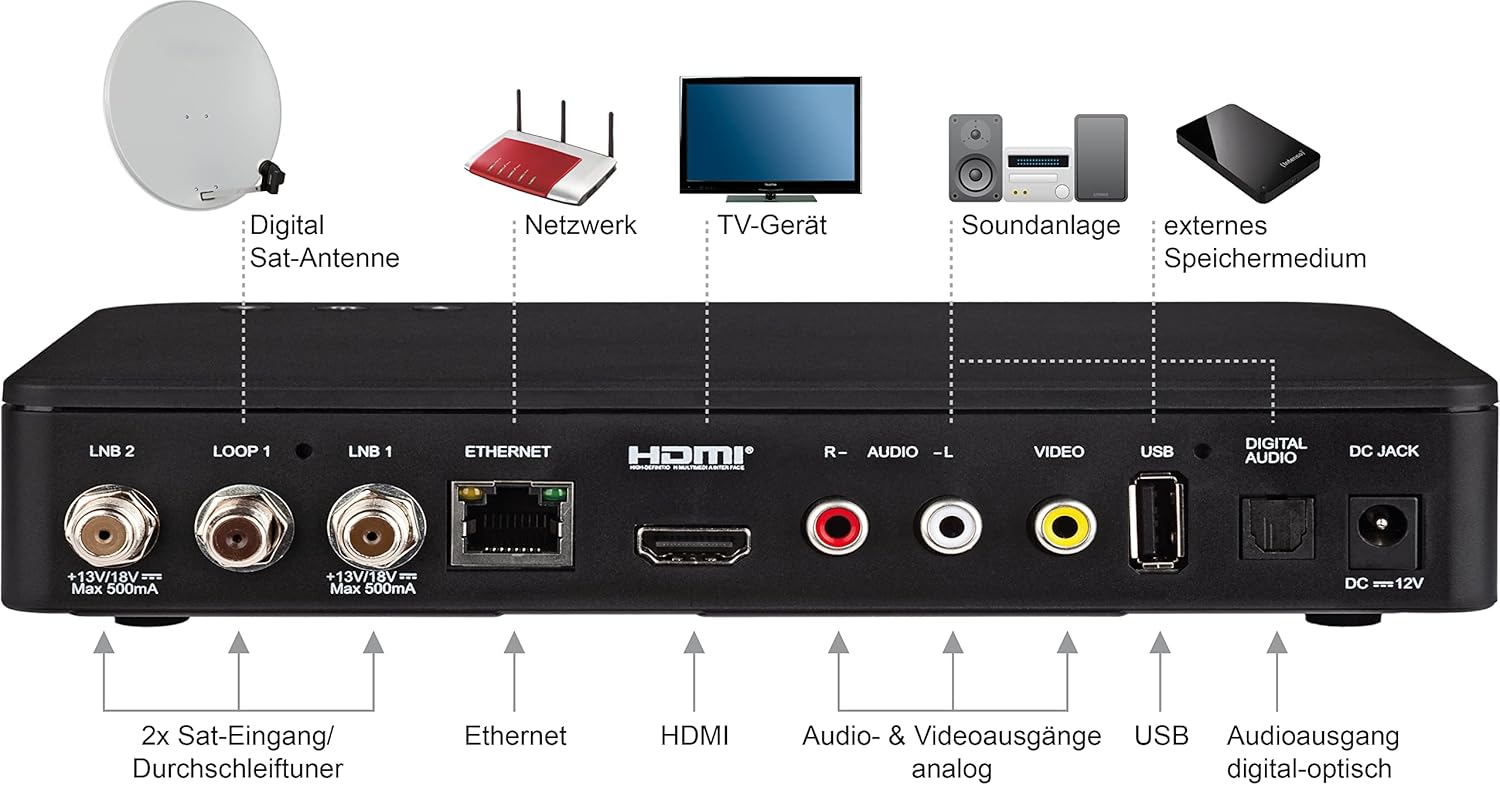 • ANSCHLÜSSE – 1 × HDMI, 3 × Cinch Out, 1 × optischer Digitalausgang, 2 × USB, 1 × LAN (RJ45), 2 × F-Buchse, 1 × Durchschleiftuner