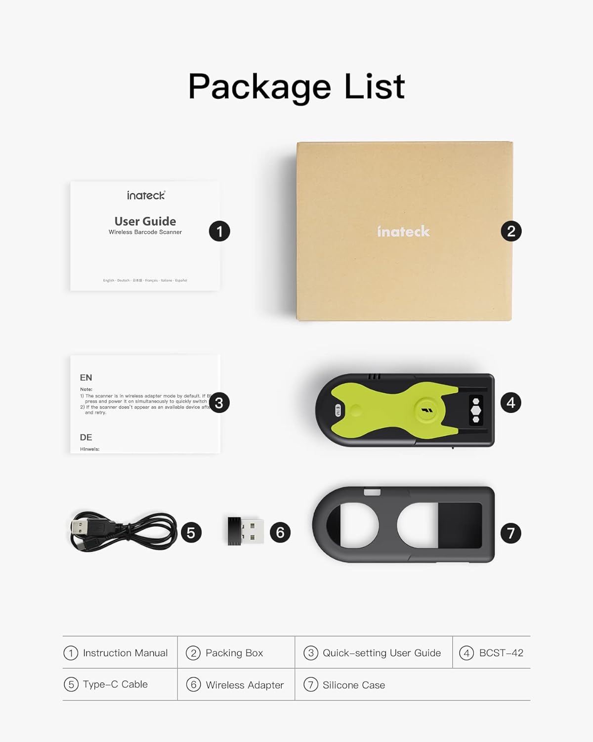- Im Gegensatz zu den meisten anderen Scannern können Sie bei diesem Scanner häufig genutzte Funktionen wie die Kopplung über Bluetooth/2.4G, das Aufrufen und Beenden des Inventurmodus und die Überprüfung des Batteriestands mit Hilfe von Schnelltasten