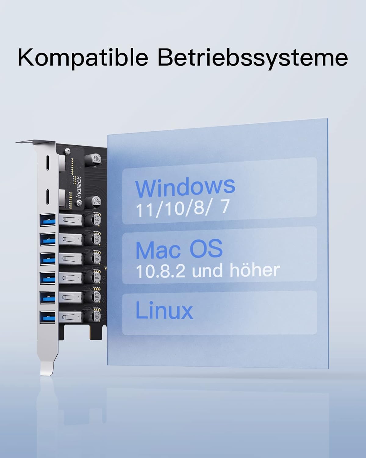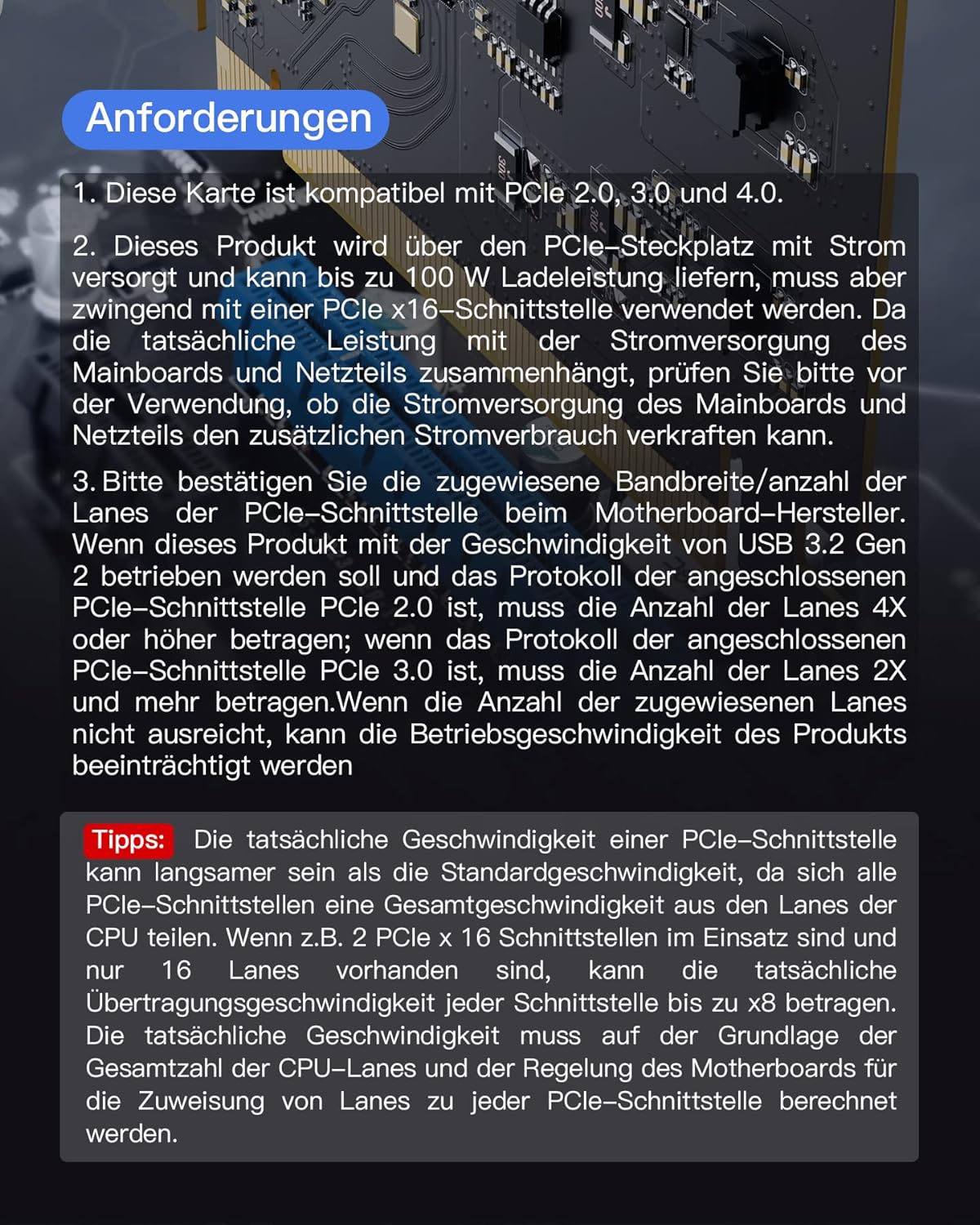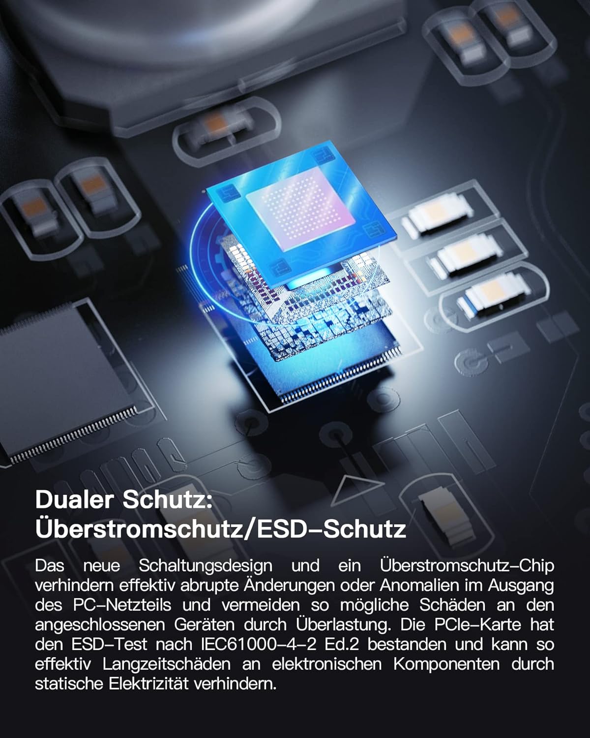 - Diese PCIe-zu-USB 3.2 Gen 2-Karte verfügt über einen Überstromschutz-Chip und hat den IEC61000-4-2 Ed.2 ESD-Test bestanden, wodurch Ihr Computer und Ihre Geräte besser geschützt sind.
