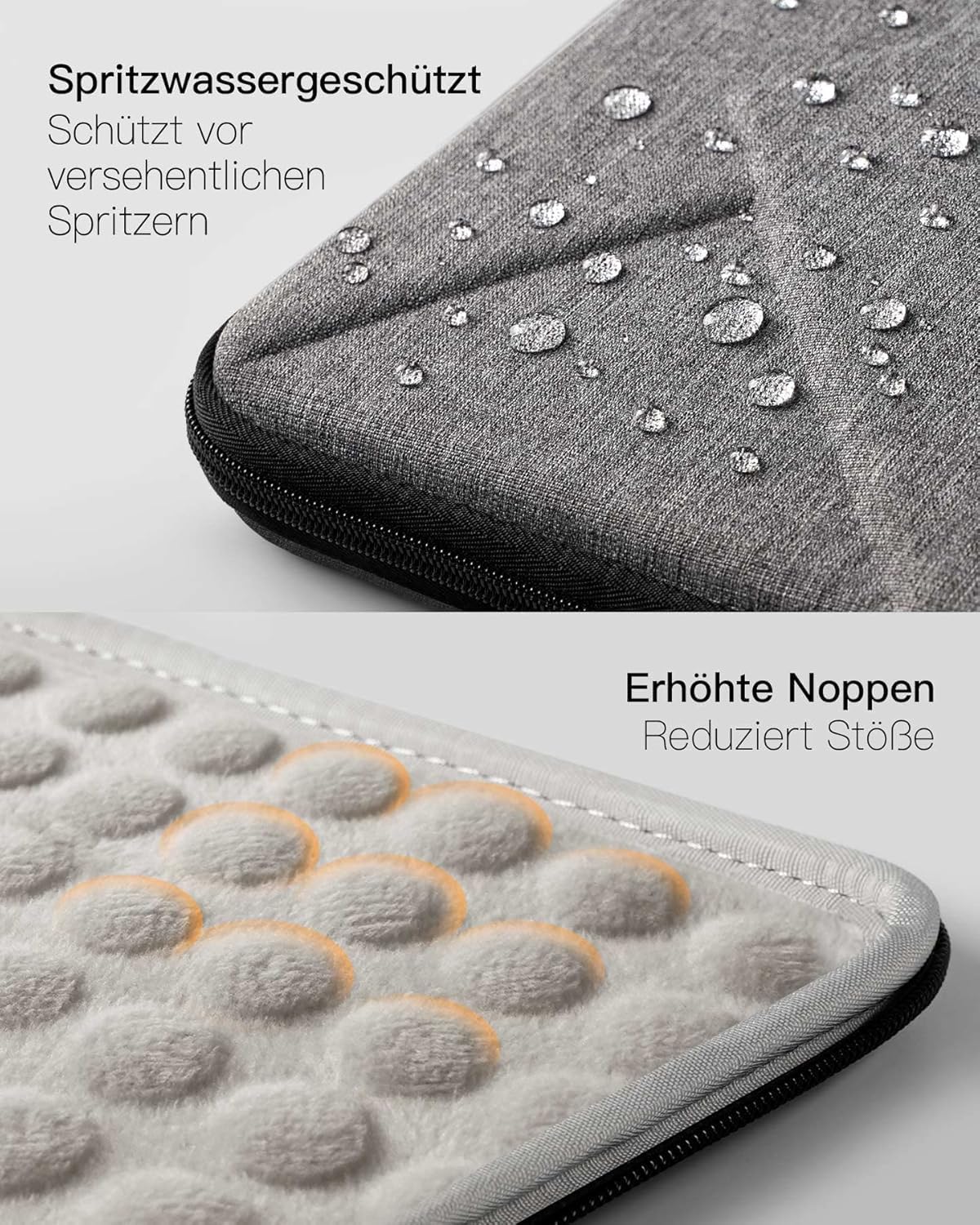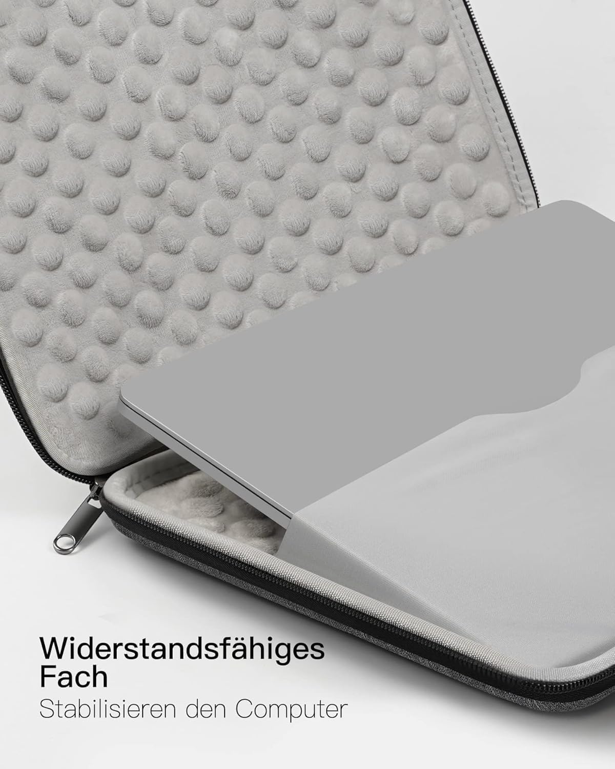 - Leicht zu transportieren: Wenn Sie diese Laptoptasche in der Hand halten, haben Sie mehr Halt als bei einer gewöhnlichen EVA-Tasche mit glatter Oberfläche. Dementsprechend rutscht diese Laptoptasche nicht so leicht von Ihren Händen ab.