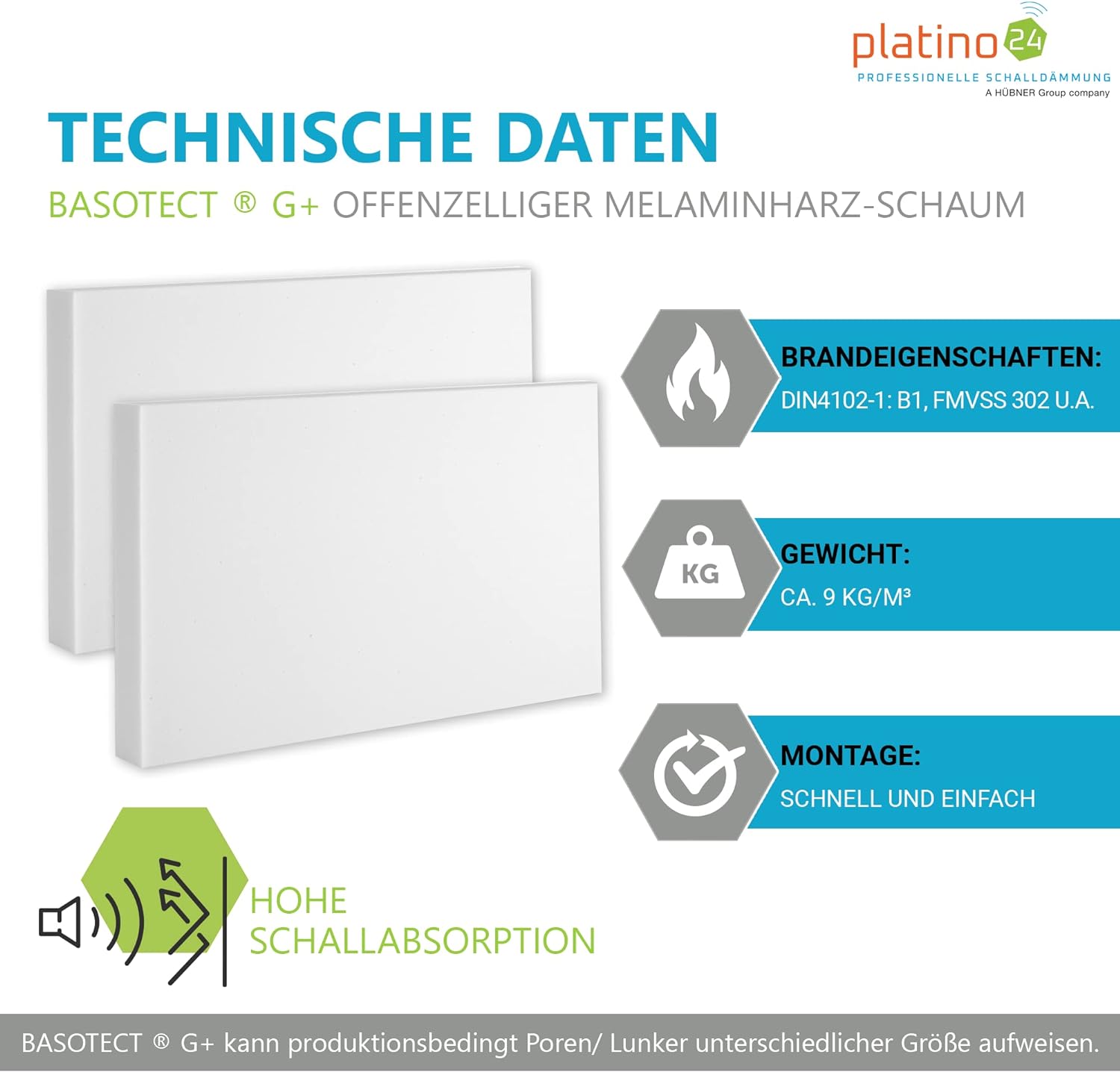 • BASOTECT G+: Die offenzellige Struktur ermöglicht das Eindringen der Schallwellen und reduziert somit den Hall. Zudem ist Basotect G+ nach DIN4102-1:B1 schwer entflammbar und bis +240°C temperaturbeständig.