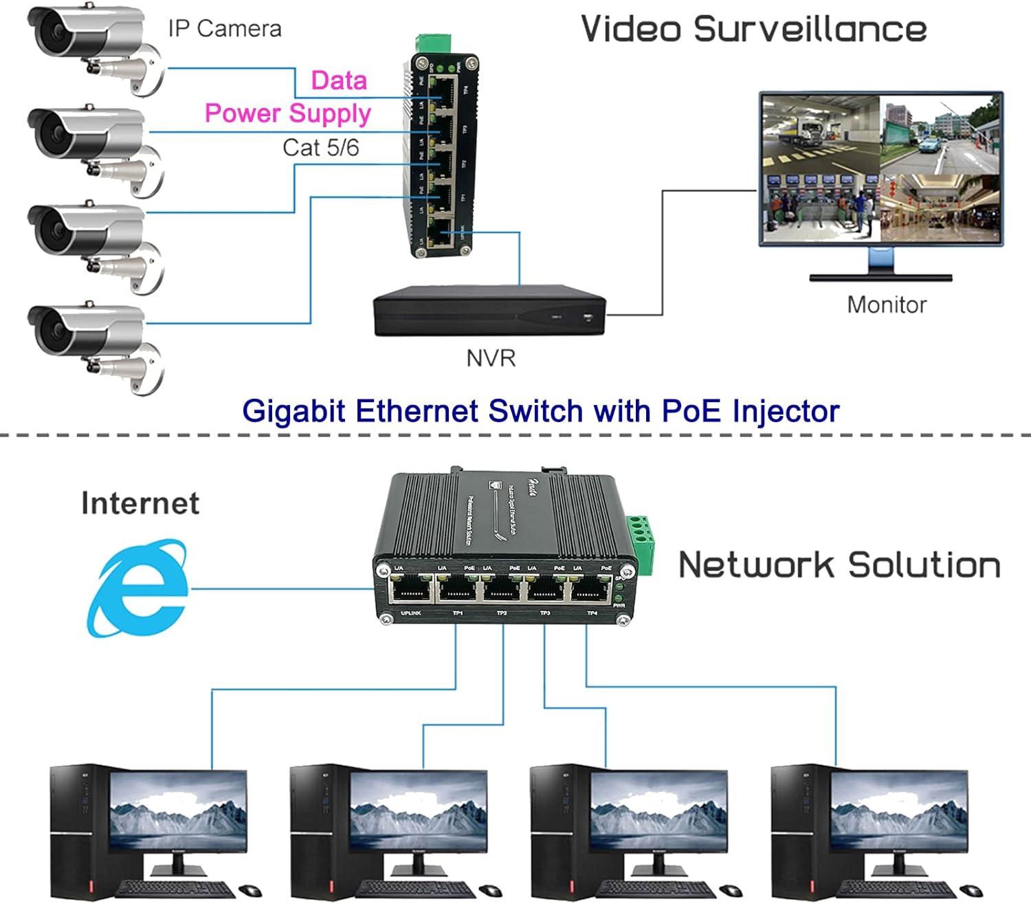 - PoE-Switch: 12 ~ 48 V DC Eingang (48 V, wenn PoE verwendet wird), 1 RJ45-Ethernet-Dateneingang + 4 RJ45-Power-over-Ethernet-Ausgang (Daten + Strom), PoE-Einsatz: < 125 W, entspricht IEEE 802.3at