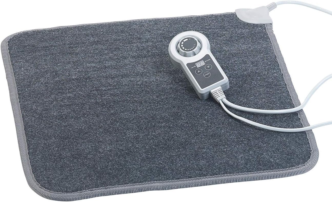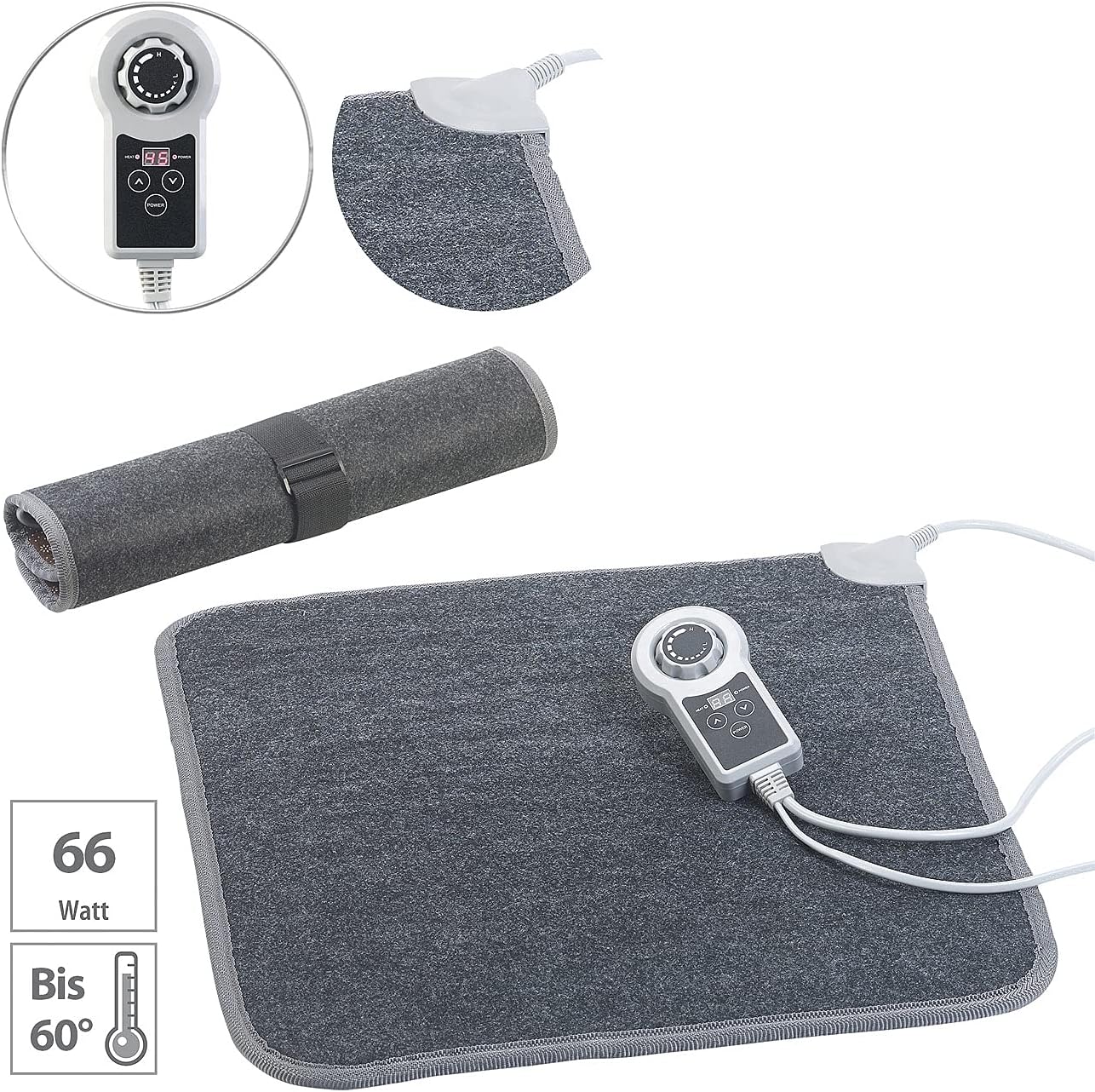 - Integriertes LED-Display: zeigt Temperatur und Timer • Angenehm weiche Textiloberfläche: grauer Vliesstoff aus Polyester • Masse: 50 x 55 cm, Gewicht: 450 g