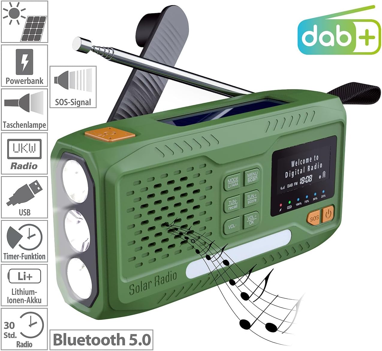 • Kurbel-Digitalradio mit Unterstützung für Notfall-Warn-Funktion (EWF) • Starker Li-Ion-Akku für bis zu 30 Stunden Musik • Integrierte Taschenlampe mit SOS-Funktion & Nachtlicht mit Warnlicht-Funktion • Bluetooth 5 für kabellose Verbindung mit