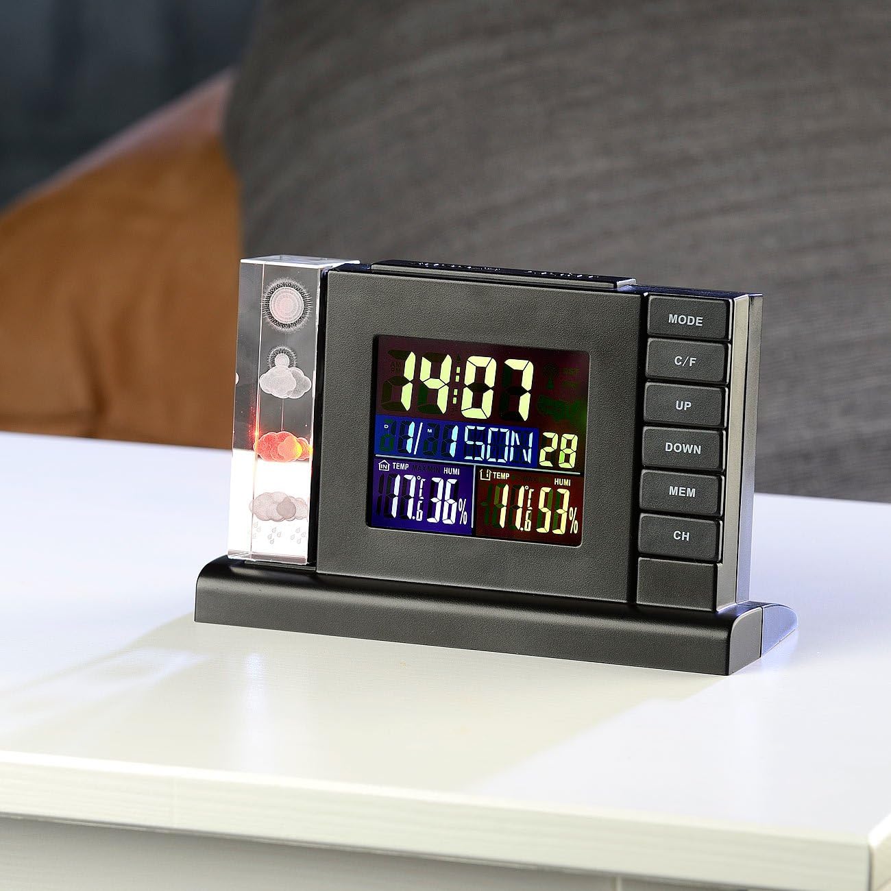 - Digitales Thermometer & Hygrometer • Wetterprognose über anschauliche Symbole • Minimum-/Maximum-Speicher • Funkuhr mit Weckfunktion • Grosses LCD-Farbdisplay • Betrieb mit Netzteil oder Batterien