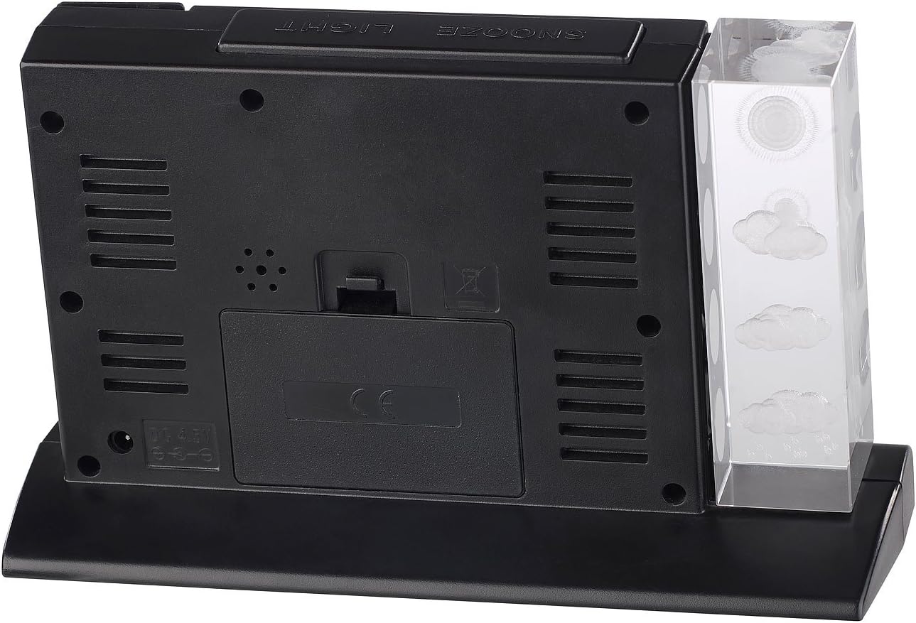 - Minimum-/Maximum-Speicher für Temperatur und Luftfeuchte • Funkwecker mit Schlummerfunktion (Snooze) • Wetterprognose über 4 beleuchtete Hologramm-Symbole: sonnig, teilweise bewölkt, bewölkt, regnerisch • Stromversorgung Wetterstation: Netzteil