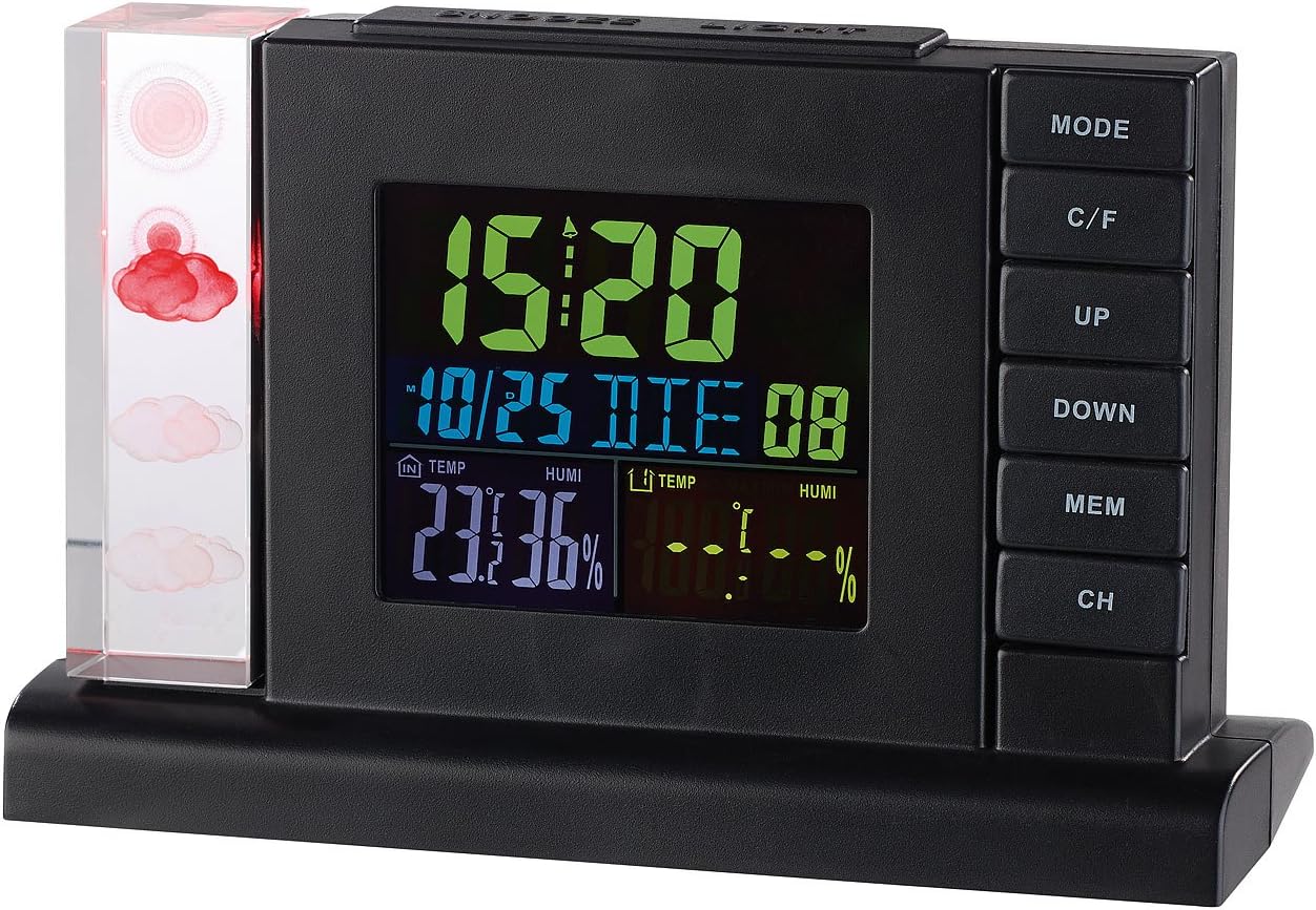 - Funk-Wetterstation inklusive Funk-Aussensensor, Netzteil und deutscher Anleitung. Wetterstation Projektionsuhr - Ausserdem relevant oder passend zu: Projektionswecker, Aussenthermometer, Crystal Cube, Projektion, Barometer, Geschenk, LED Uhr, Wetter,