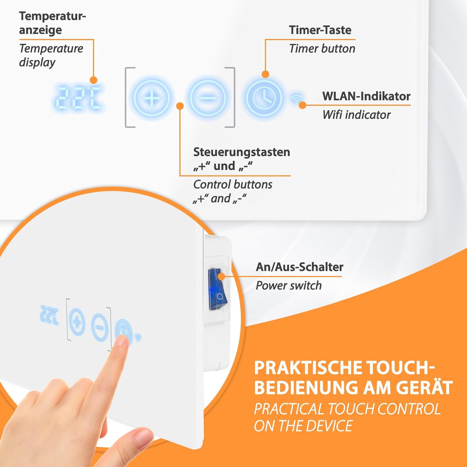 - Integriertes Thermostat mit Touch-Bedientasten auf der Glas-Front des Paneels
