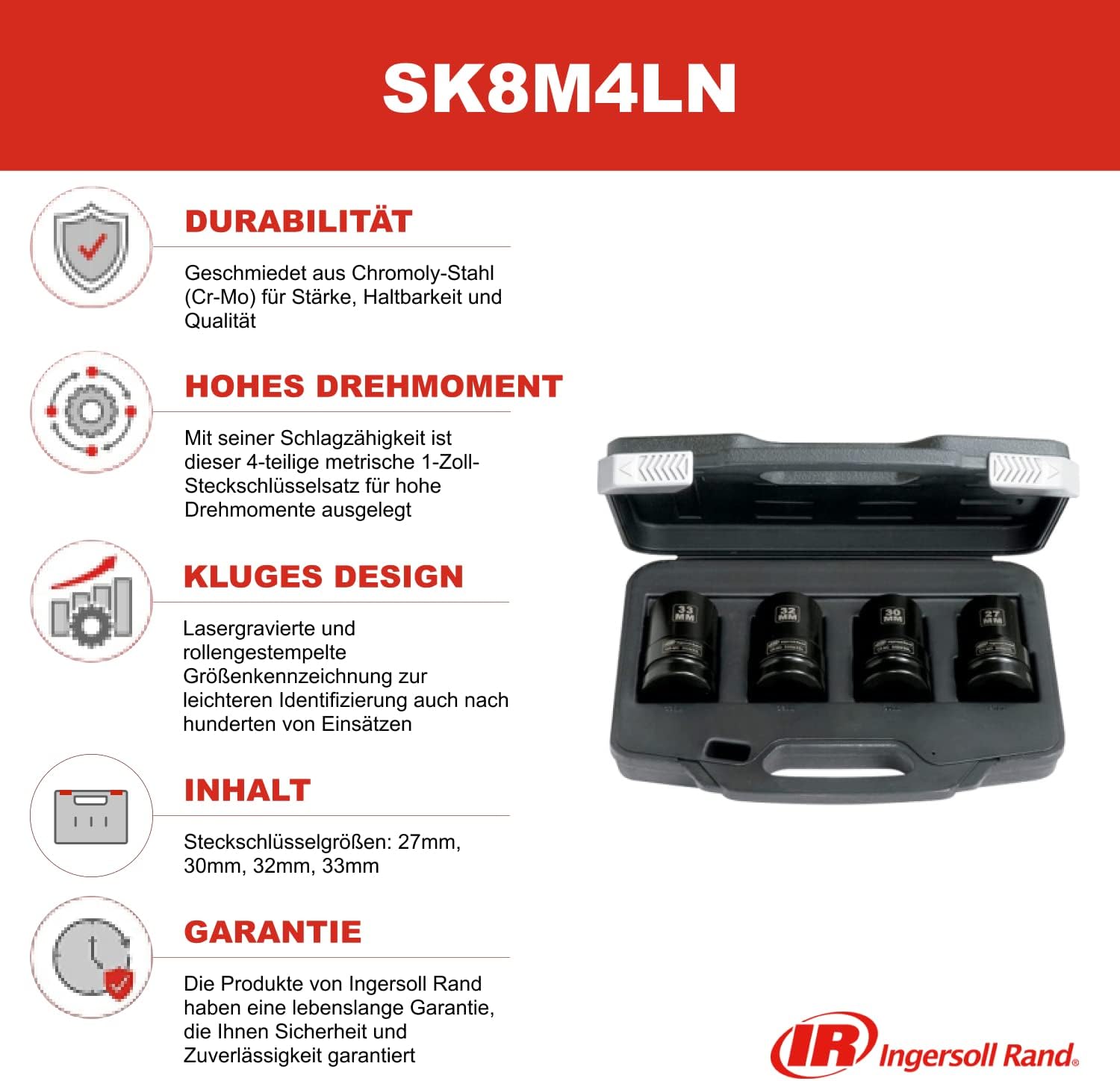 - Steckschlüsselgrössen: 27, 30, 32, 33 mm
