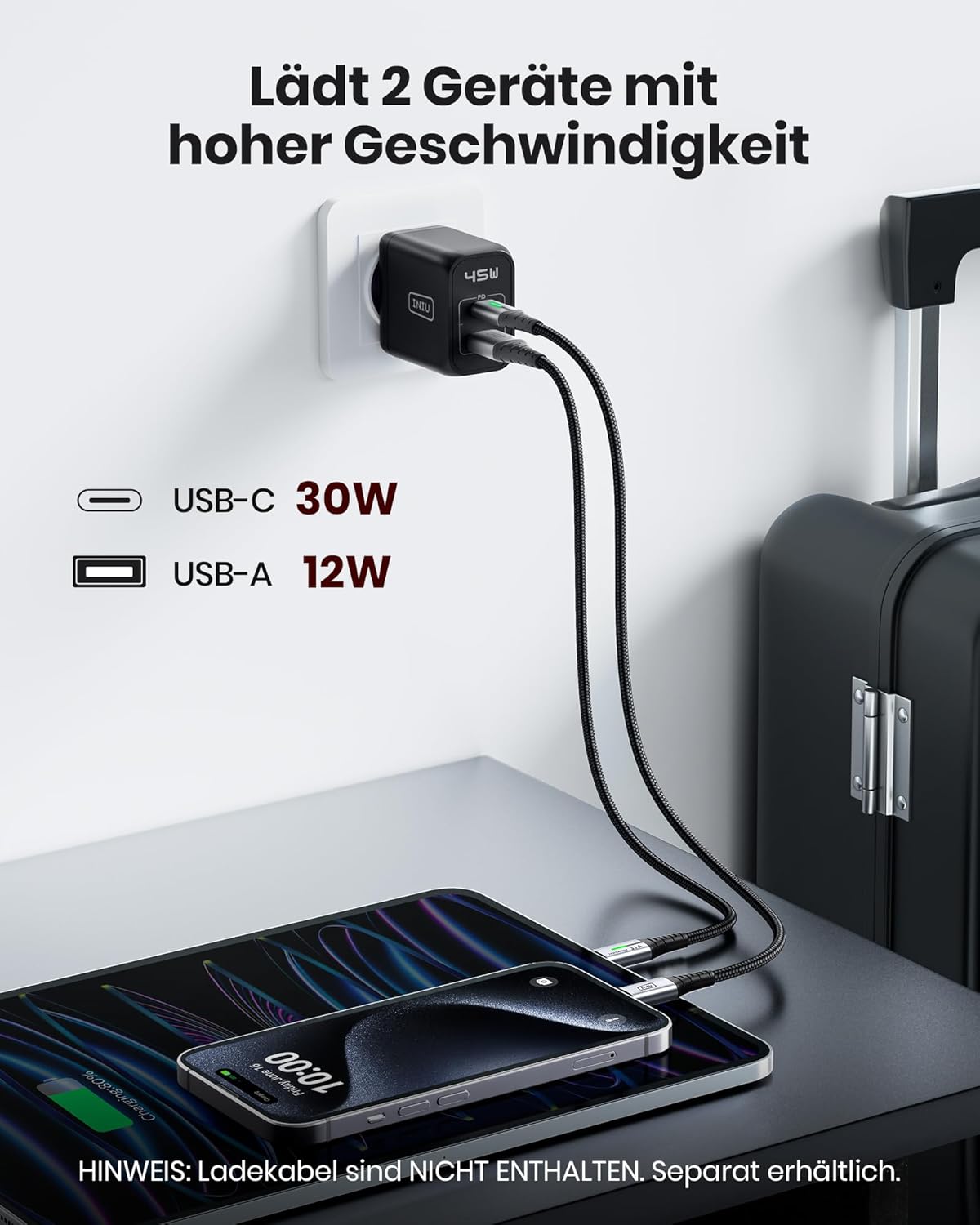 - Gleichzeitiges Laden von Zwei Geräten: Sie brauchen nicht zwei Ladegeräte, sondern können Ihre USB-A- auf USB-C- oder USB-C- auf Lightning-Geräte gleichzeitig aufladen *Hinweis: 2 Geräte werden gleichzeitig mit nsgesamt 42W (30W & 12W) geladen.