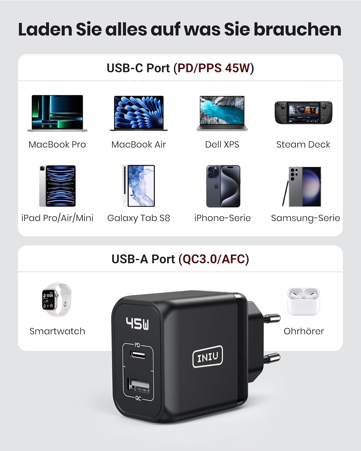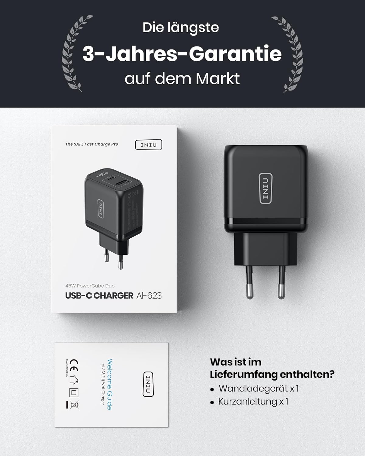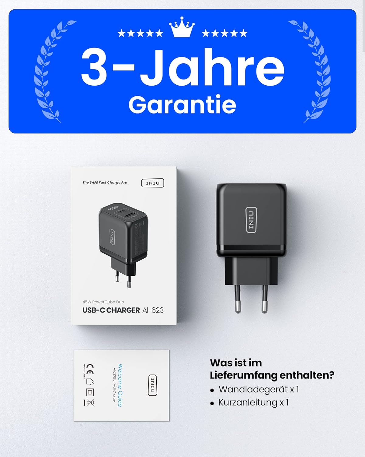 - Was Sie Erhalten: GaN 45W Dual-USB-C-Ladegerät x 1, Bedienungsanleitung x 1, sowie lebenslange technische Unterstützung. Wenn es innerhalb von 3 Jahren ein Qualitätsproblem gibt, bitte kontaktieren Sie uns direkt und wir werden Ihnen einen neuen