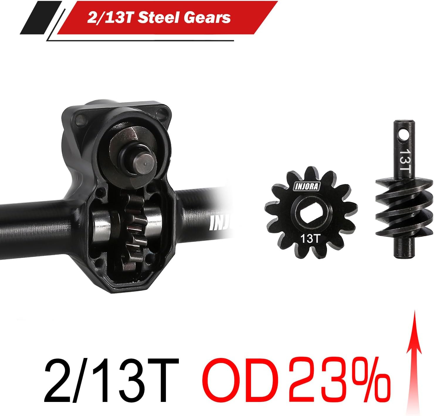 - Die Vorderachse ist mit einem 13T-Stahlzahnrad (Overdrive 23%) ausgestattet, das Ihr Fahrzeug vorne schneller antreibt und das Klettern verbessert sowie Überschläge reduziert. Das hintere Zahnrad hat 16T.