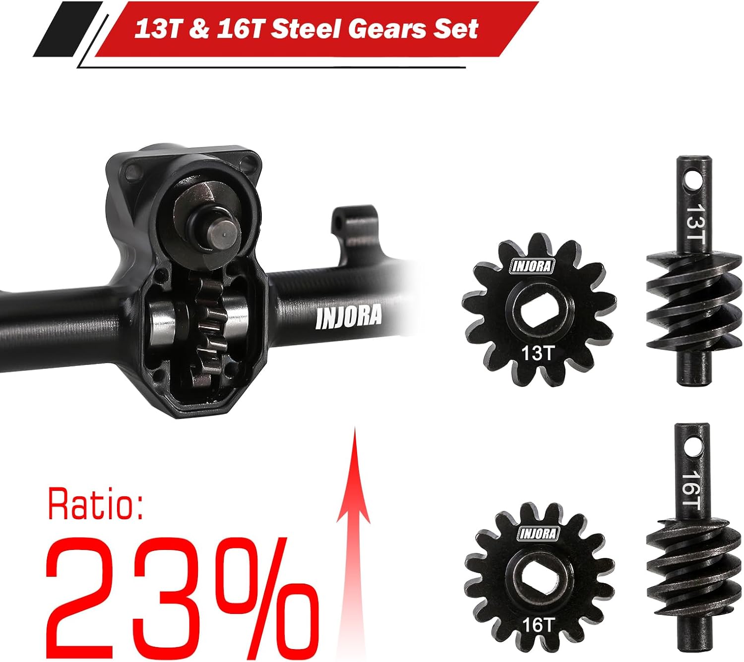 - Die Vorderachse ist mit einem 13T-Stahlzahnrad (Overdrive 23%) ausgestattet, das Ihr Fahrzeug vorne schneller antreibt und das Klettern verbessert sowie Überschläge reduziert. Das hintere Zahnrad hat 16T.
