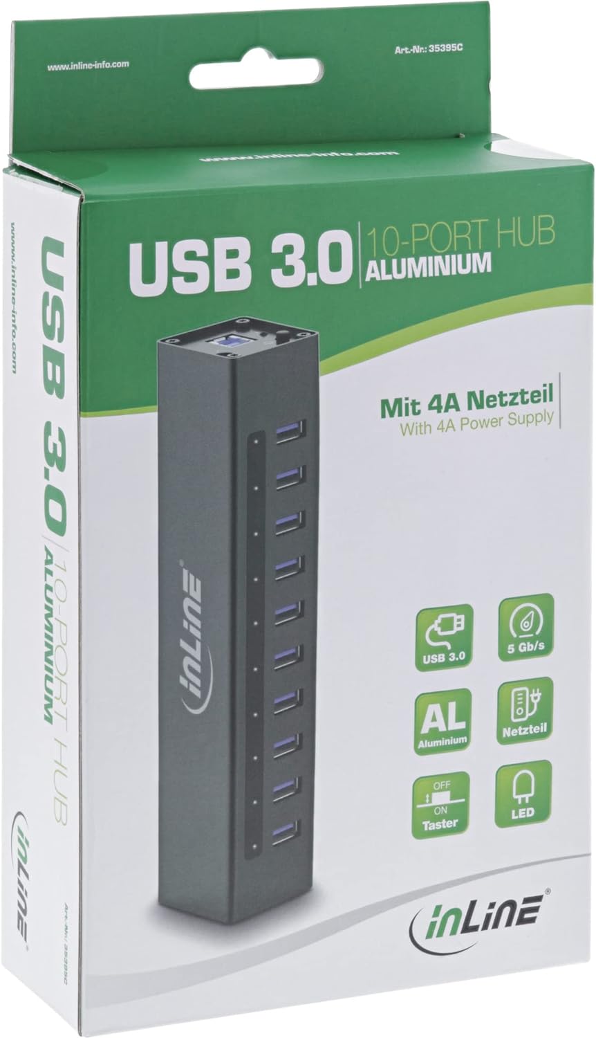 - Inhalt: USB3.0 10-Port HUB, USB3.0-Datenkabel, Benutzerhandbuch, Netzteil 12V/4A