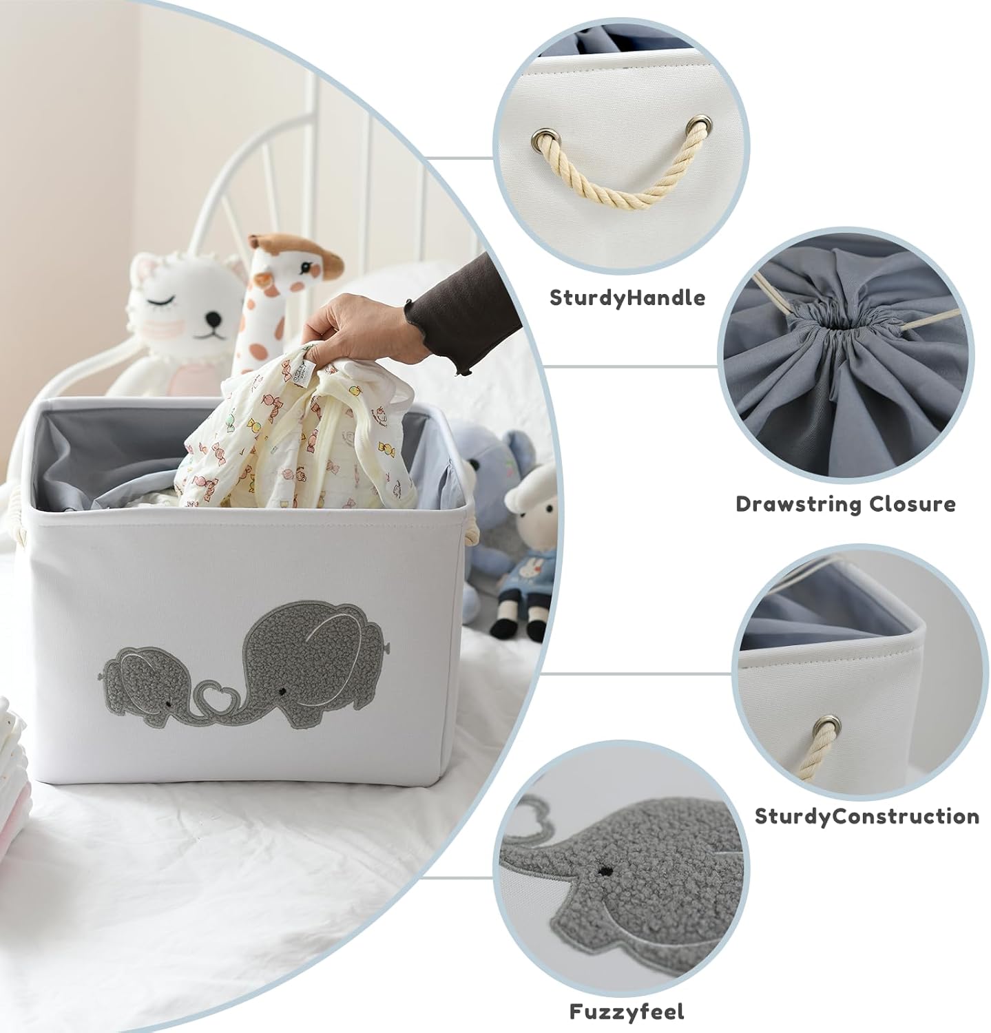 - √Handgefertigte Stickerei: Unser Kinderkorb ist mit einem Elefantenmuster bestickt, das dem Design eine besondere Textur und Tiefe verleiht. Das gestickte Elefantenmuster in neutraler Graufarbe fügt jedem Kinderzimmer eine verspielte und niedliche